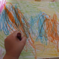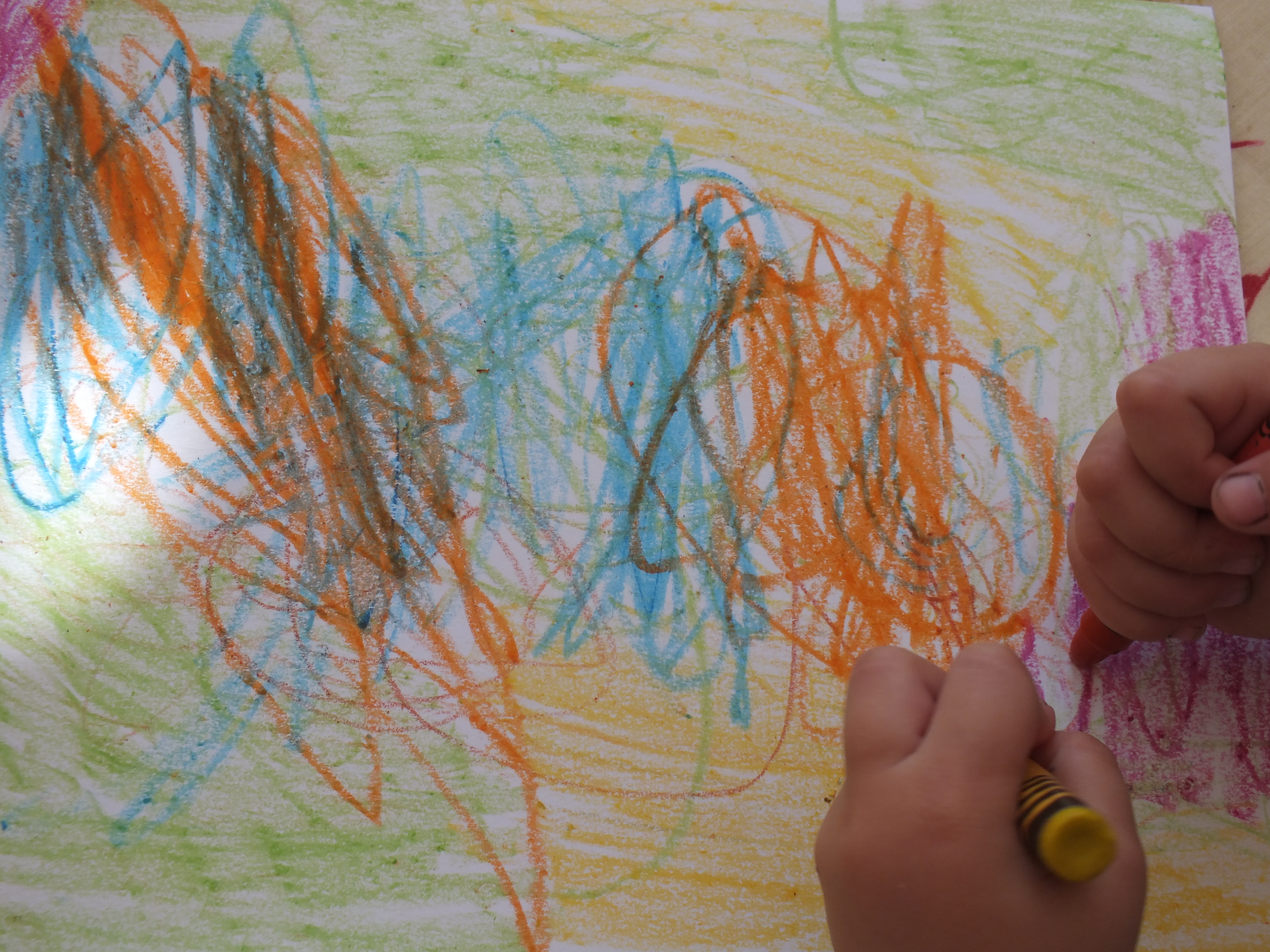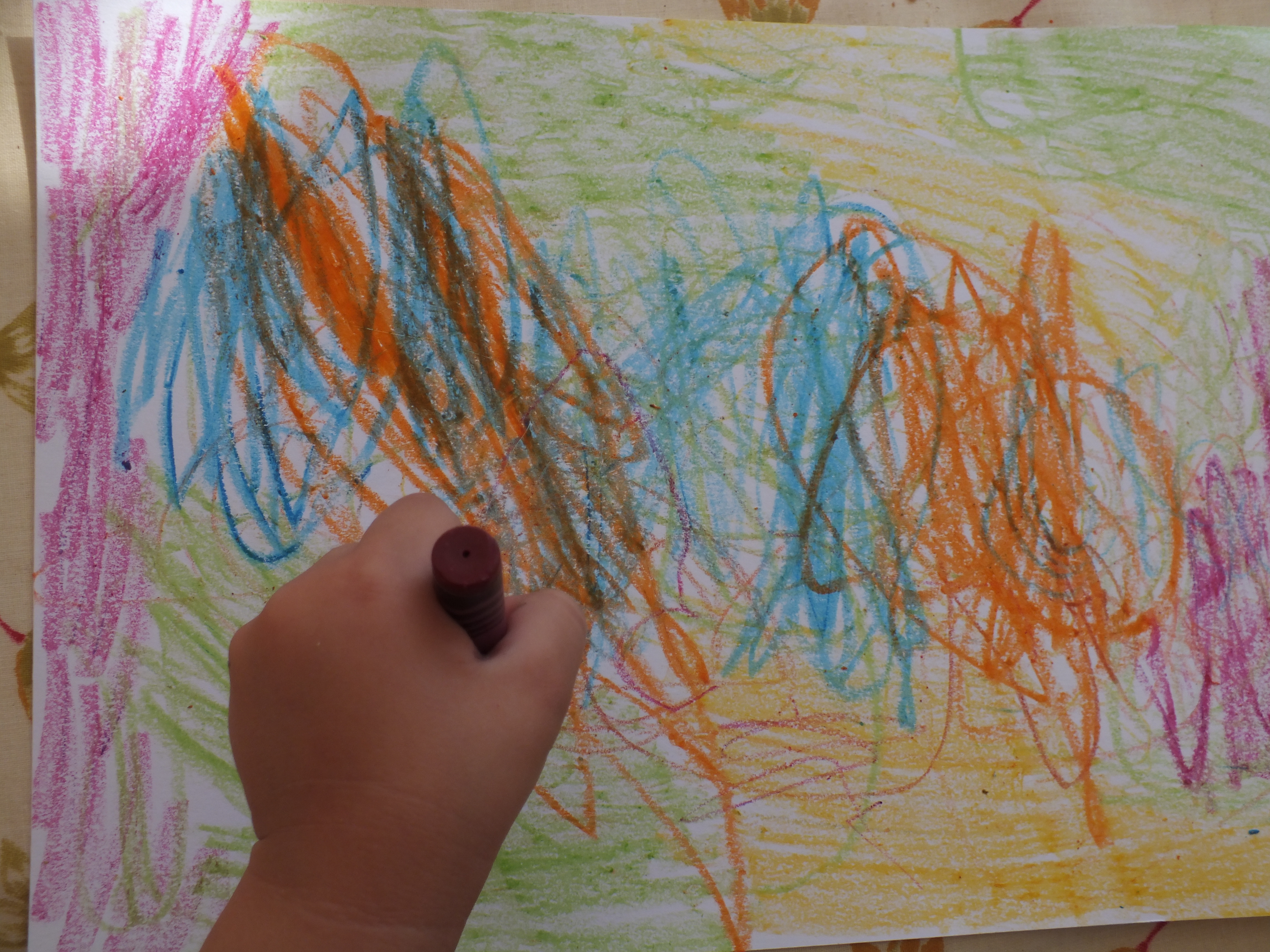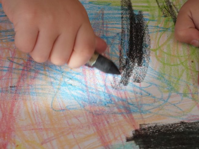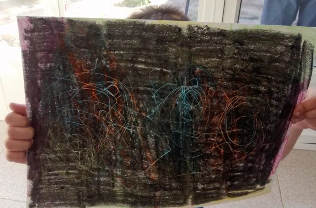 Obviamente, mis hijos no dibujaron edificios, pero sí que experimentaron con las ceras blandas y se sorprendieron mucho al ver que, debajo de la capa negra estaban los colores de las otras ceras.