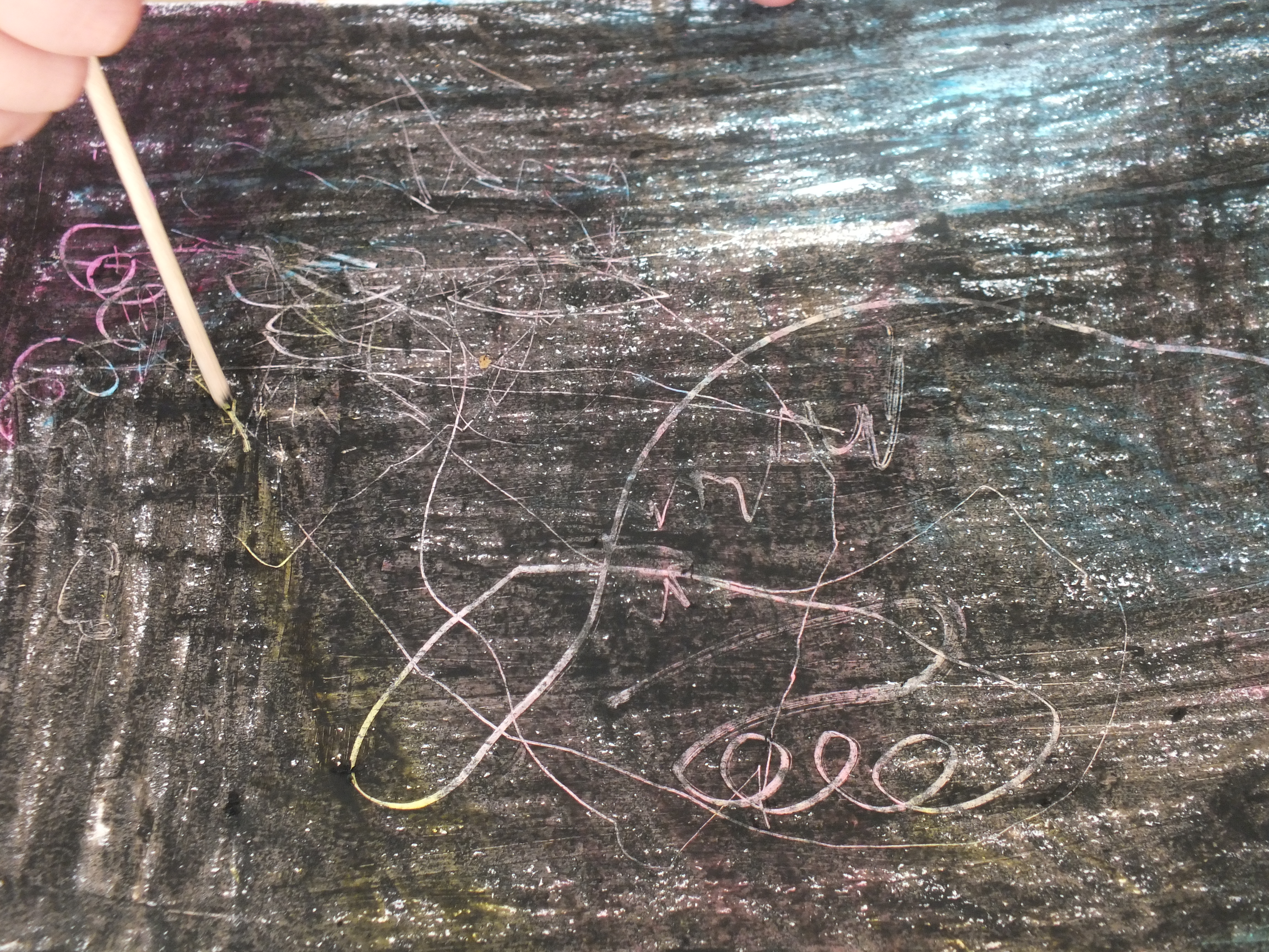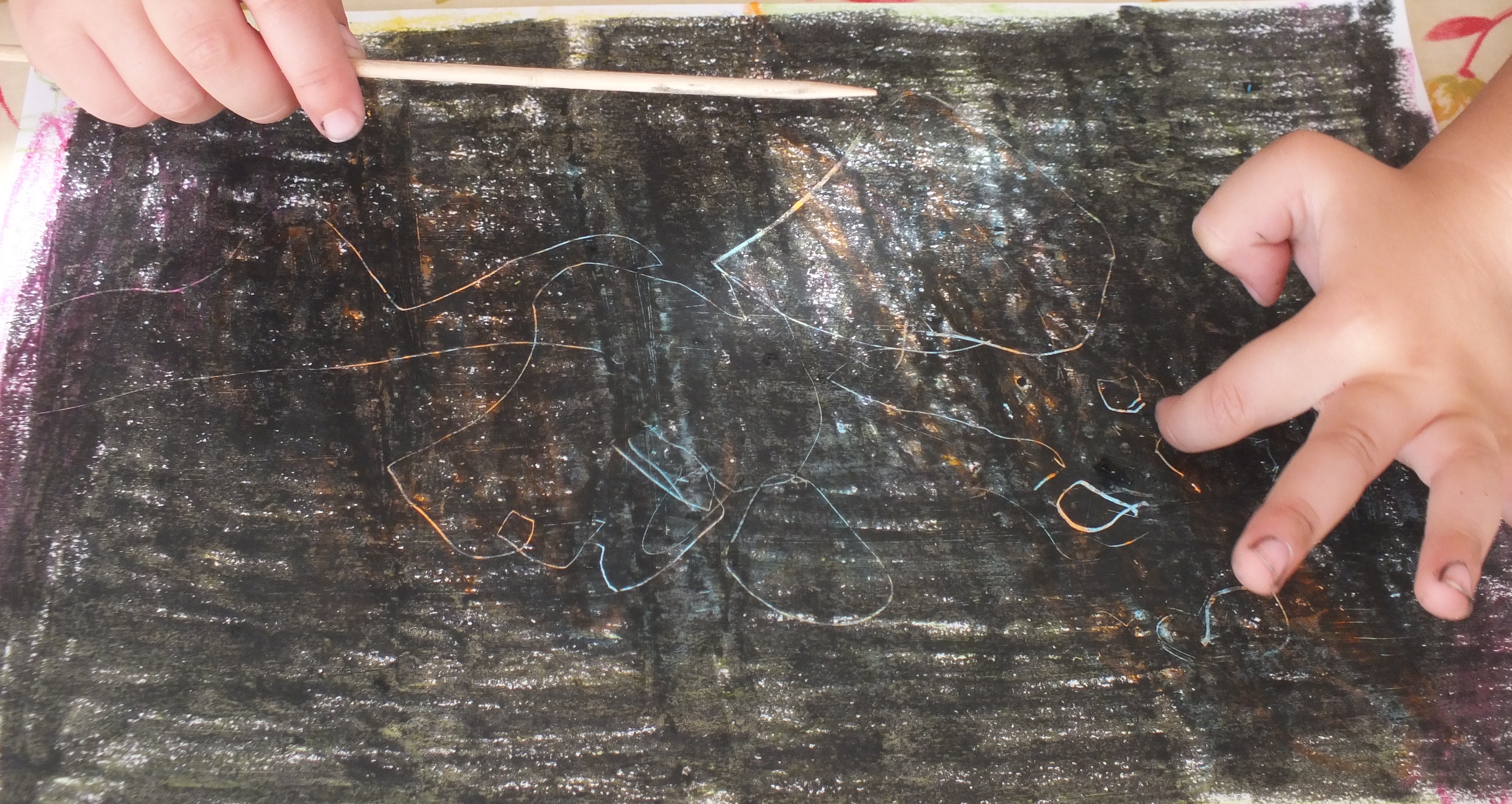 - Finalmente, les dí un palillo de madera a cada uno y les expliqué que debían de dibujar con el palillo sobre la capa de color negro, viendo así cómo surgían los colores conforme pasaban el palillo por encima.