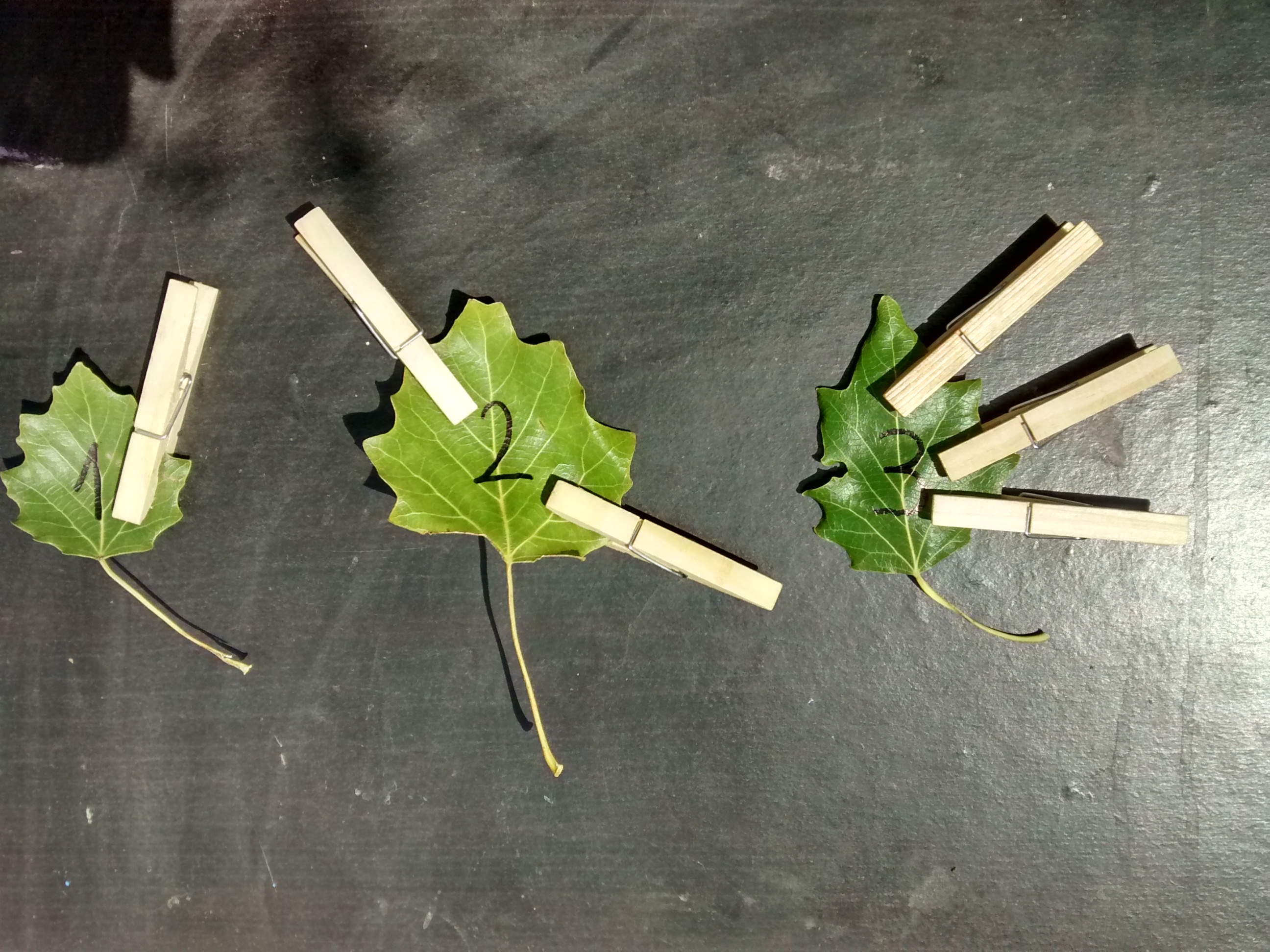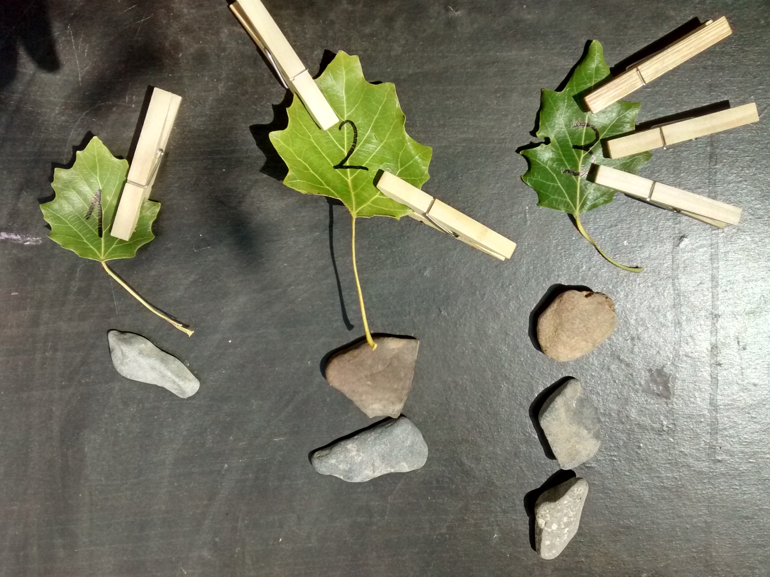 Les puse las hojas encima de la mesa junto a una cesta con las pinzas de tender y piedras en otra cesta.