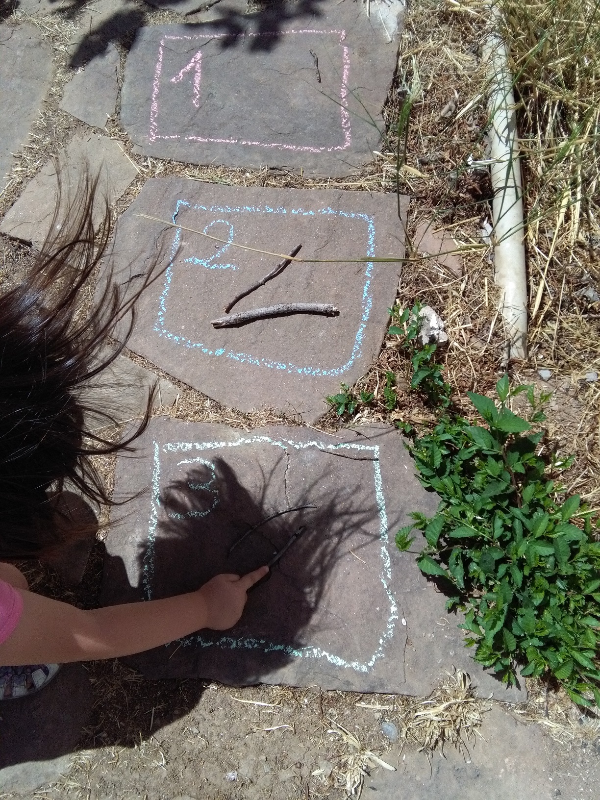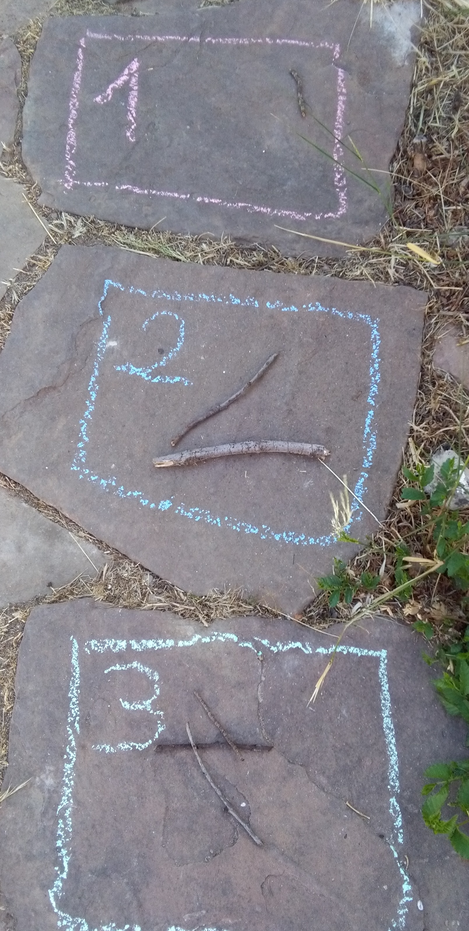 Dibujé con tiza en el suelo tres cuadrados, dentro de esos cuadrados dibujé el número 1, el 2 y el 3 respectivamente. Después invité a los niños a colocar las ramitas de árbol que correspondiesen a cada cuadrado dependiendo del número que pareciese en él.