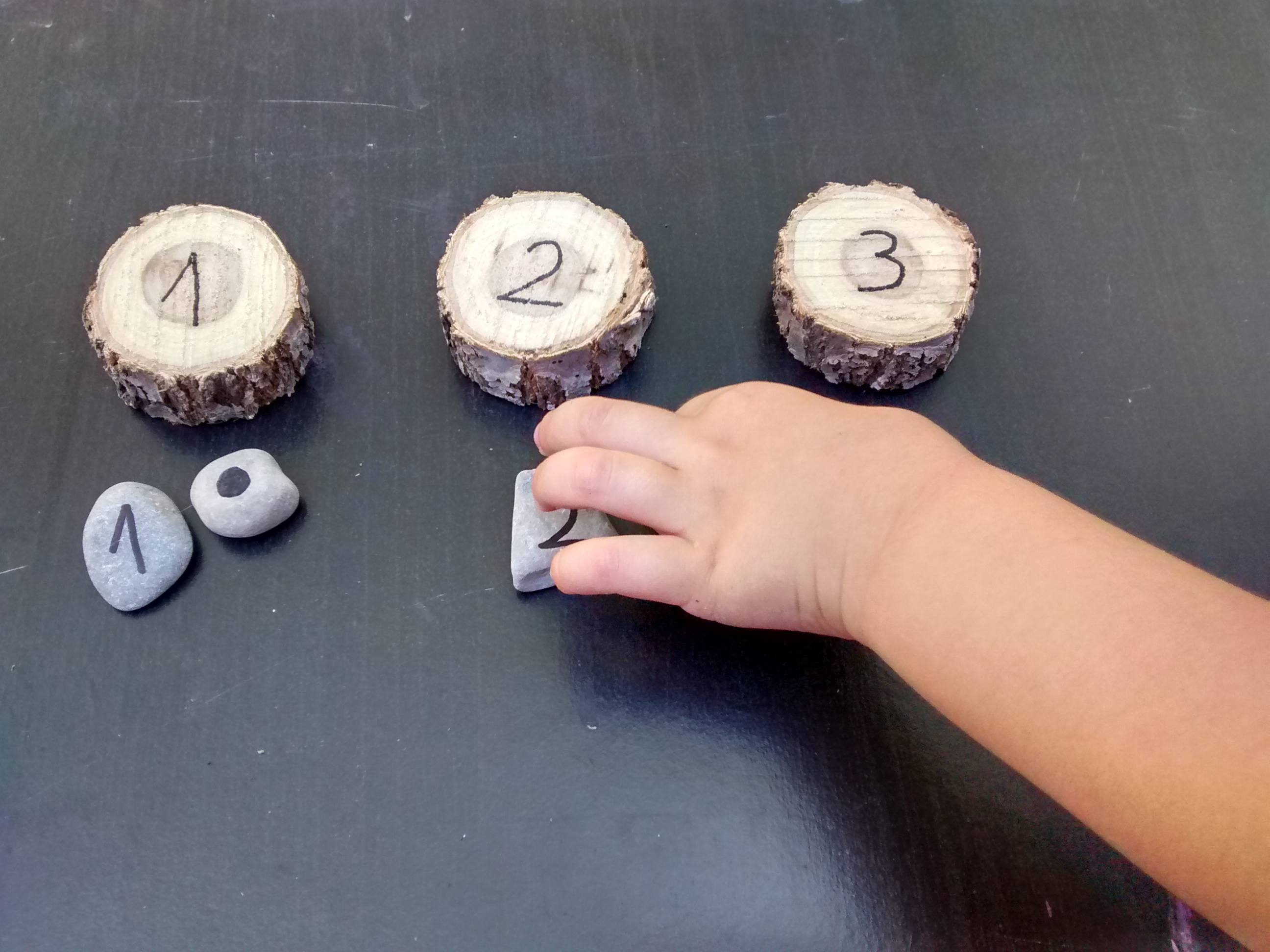 Escribí en cada una de las hojas los números del 1 al 10 y, a parte de ordenarlas con ayuda, ellos mismos decidieron volver a utilizar las piedras como cuentas para los contadores de hojas como habían hecho con los círculos de madera.