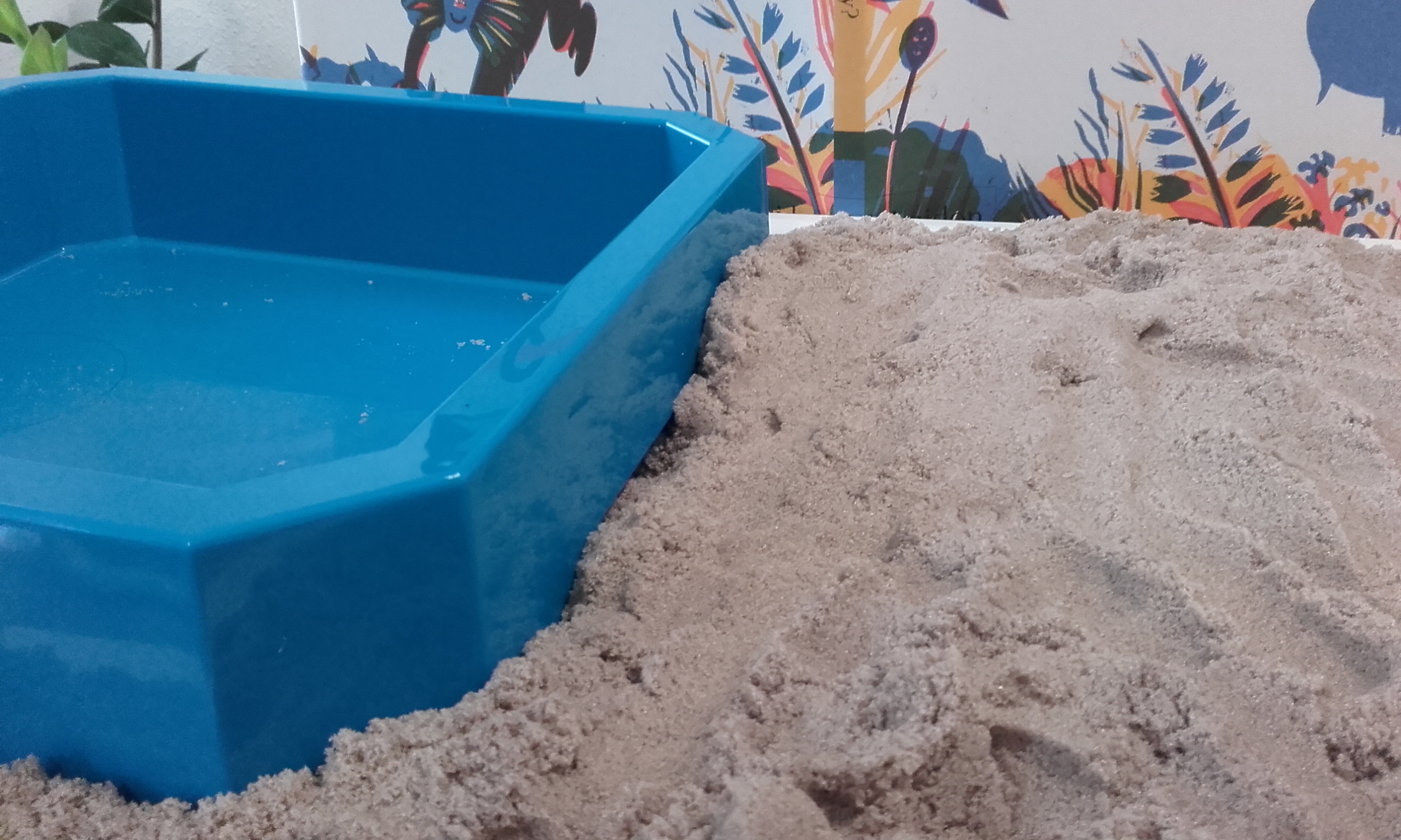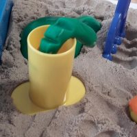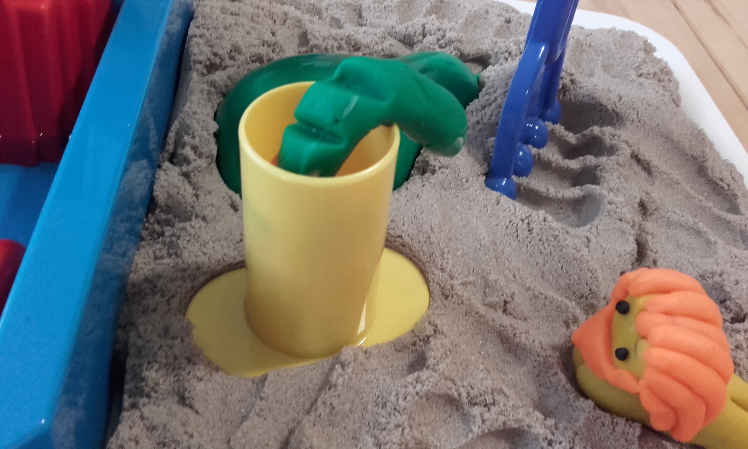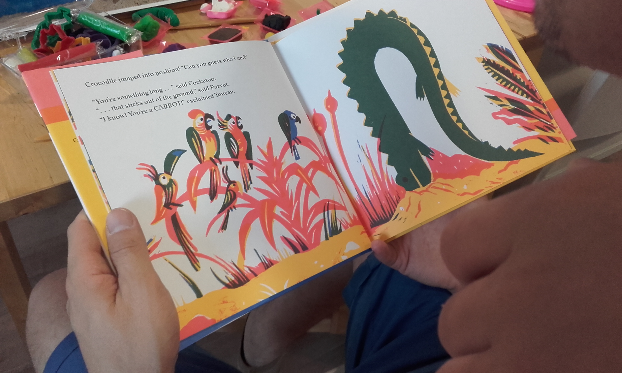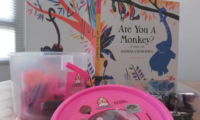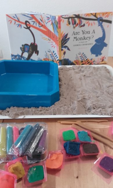 Cuando estuve viendo el libro, antes de enseñárselo a nuestro gran niño, me daban ganas de tocar, acariciar… Pensando en esto se me ocurrió que podríamos reproducir el cuento con plastilina y arena kinética. Cuando mi marido me ayudó a descubrir de qué iba la historia también pensé que podríamos jugar a lo mismo que juegan los animales en el cuento. Y es lo que hemos hecho… a medida que mi marido nos iba leyendo el cuento y descubríamos lo que estaba pasando en la historia, hemos ido reproduciendo en 3D la historia. Empezamos un fin de semana que estuvimos fuera y hemos continuados otros días. Lo decidimos hacer así porque es un cuento largo y como además está en inglés. Teníamos que adaptarnos a las capacidades de nuestro gran niño. Algunos días, después de recoger la plastilina, cogíamos el cuento y jugábamos al mismo juego al que juegan los protagonistas de esta historia.