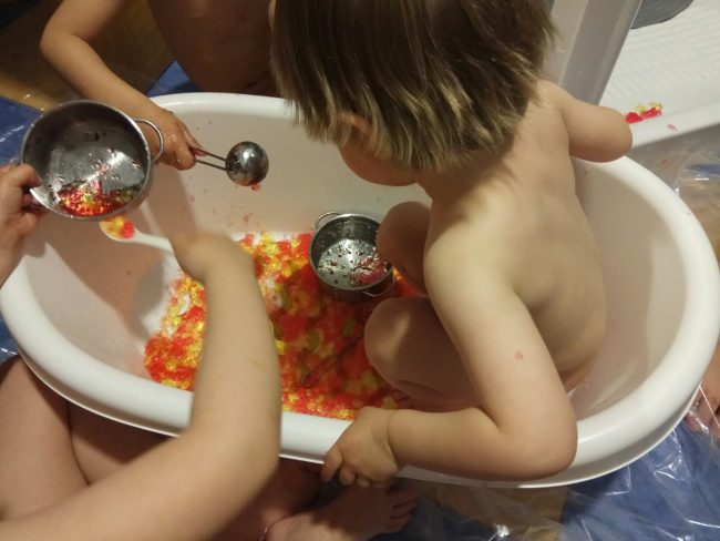 Puse un plástico protector de lluvia en el suelo y encima la bañera con gelatina. El resto… como podéis comprobar, lo hicieron ellos.