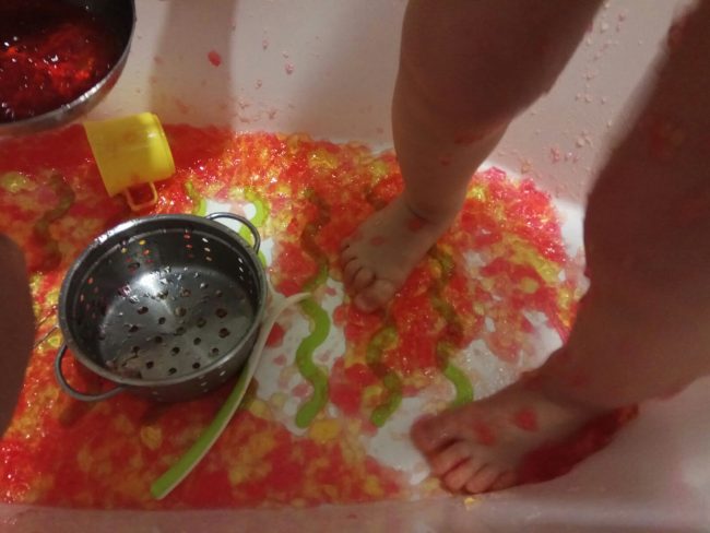 Simplemente he disuelto 6 sobres de 85 gr cada uno de gelatina de diversos colores en agua y la he dejado cuajar en la nevera. Al día siguiente, saqué de la nevera la gelatina unas horas antes del baño para que no estuviese helada y vertí la gelatina en la bañera que tenemos de cuando eran pequeños.