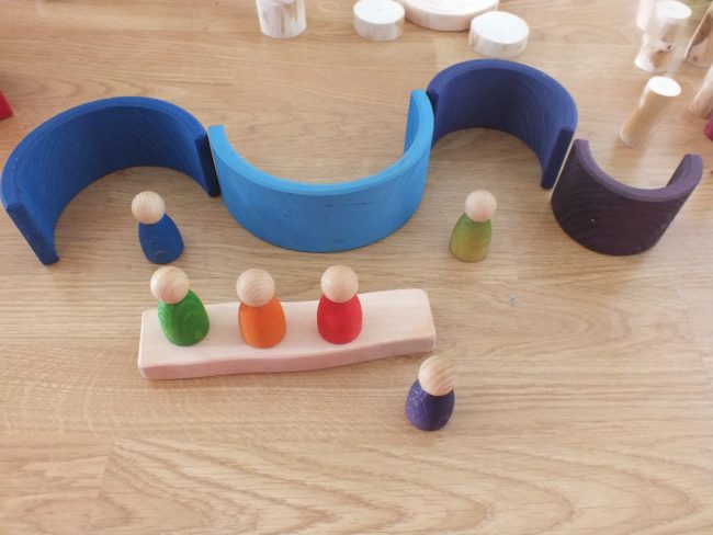 - Conforme va creciendo el niño, a partir de los 5 años aproximadamente, el juego se vuelve más complejo y a ser más imaginativo, aunque debo de decir, que construir un “pueblo de hadas” como dicen mis hijos que han construido, es bastante imaginativo y todavía no tienen 4 años XD, además, han combinado varios elementos de juego, los nins, los eco bloques naturales y el arco iris.