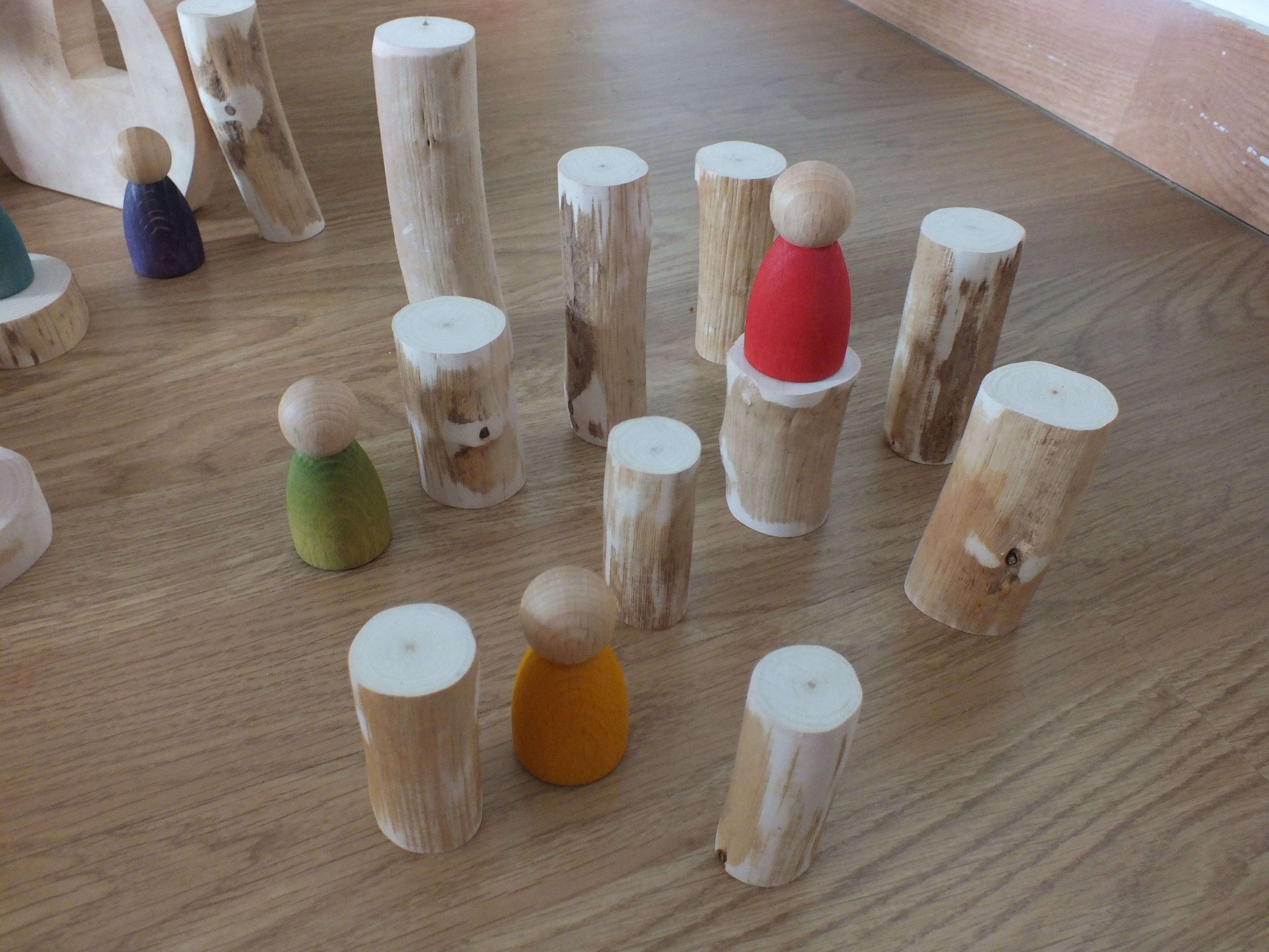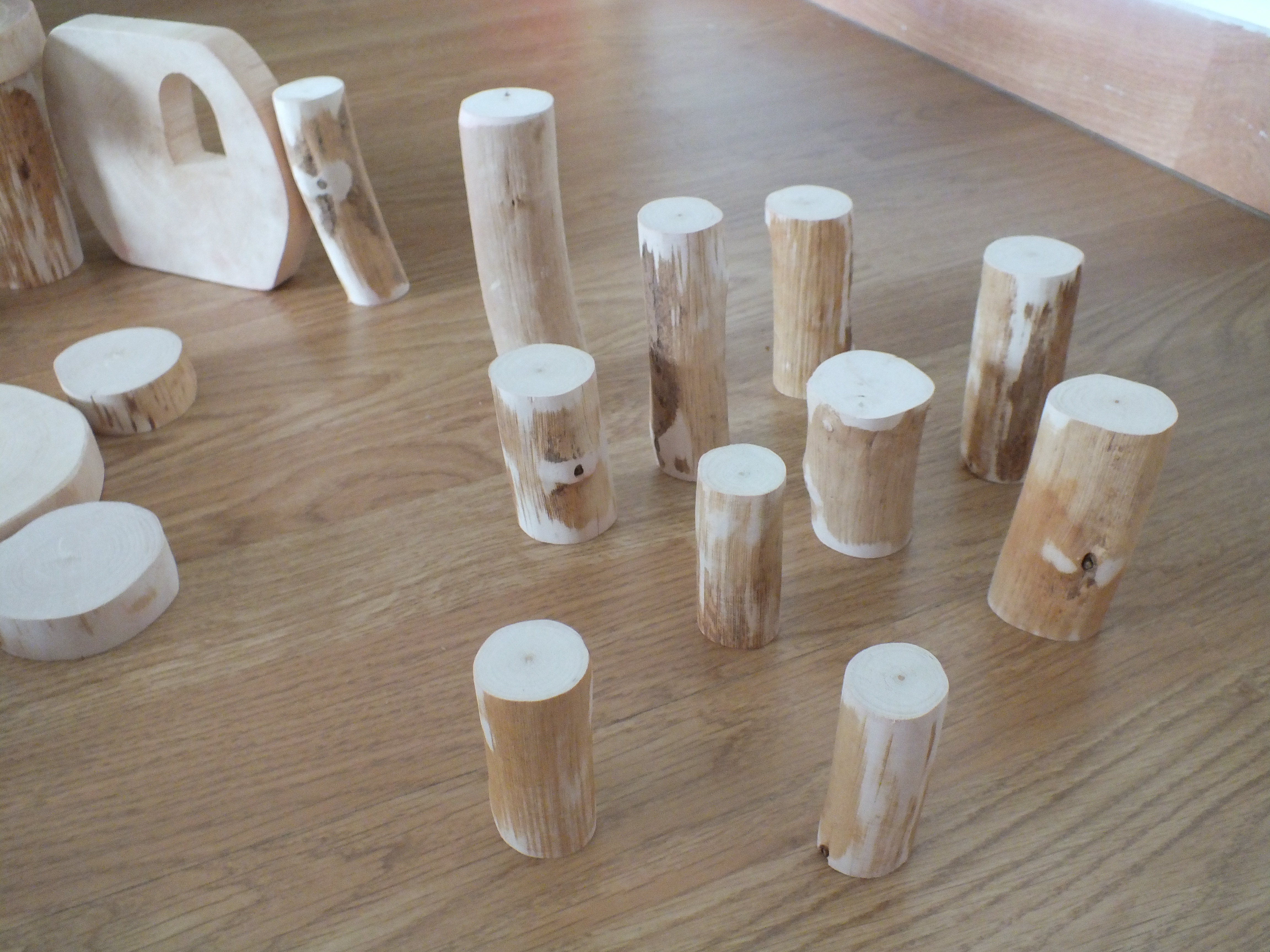 Son bloques naturales irregulares, procedentes rama cortadas de restos de poda, sin corteza, creados a partir de madera de cerezo y acabados con aceite de lino para que no resbalen al combinarse entre sí, libres de productos químicos y toxinas perjudiciales para la salud de modo que los bebés pueden disfrutar también de ellos metiéndolos y sacándolos de la bolsa o cesta de los tesoros ya que su tacto es muy suave y delicado o simplemente explorándolos. También hay eco bloques con corteza.