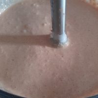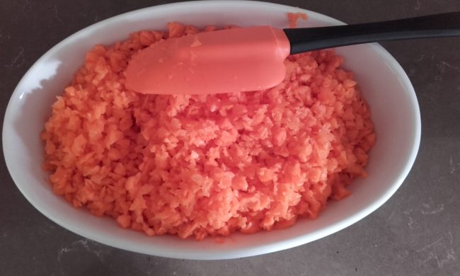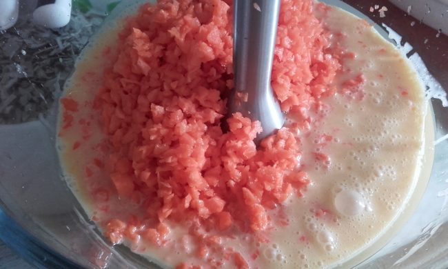 Una vez batido se añade la zanahoria picada y se mezcla con la batidora durante unos ocho segundos a una velocidad un poquito por debajo de la potencia media.