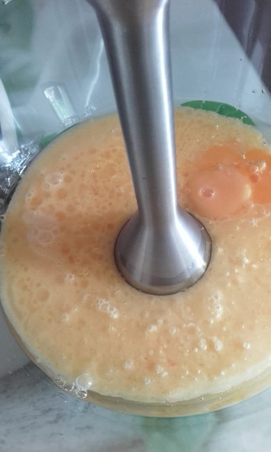En un bol se ponen los huevos, el azúcar glass con la corteza de naranja reservado y el aceite de girasol. He batido a una potencia media (mi batidora es de 800w) durante medio minuto.