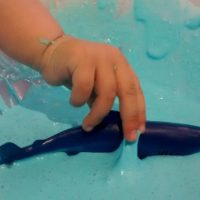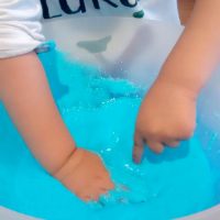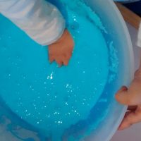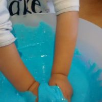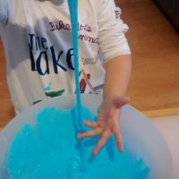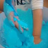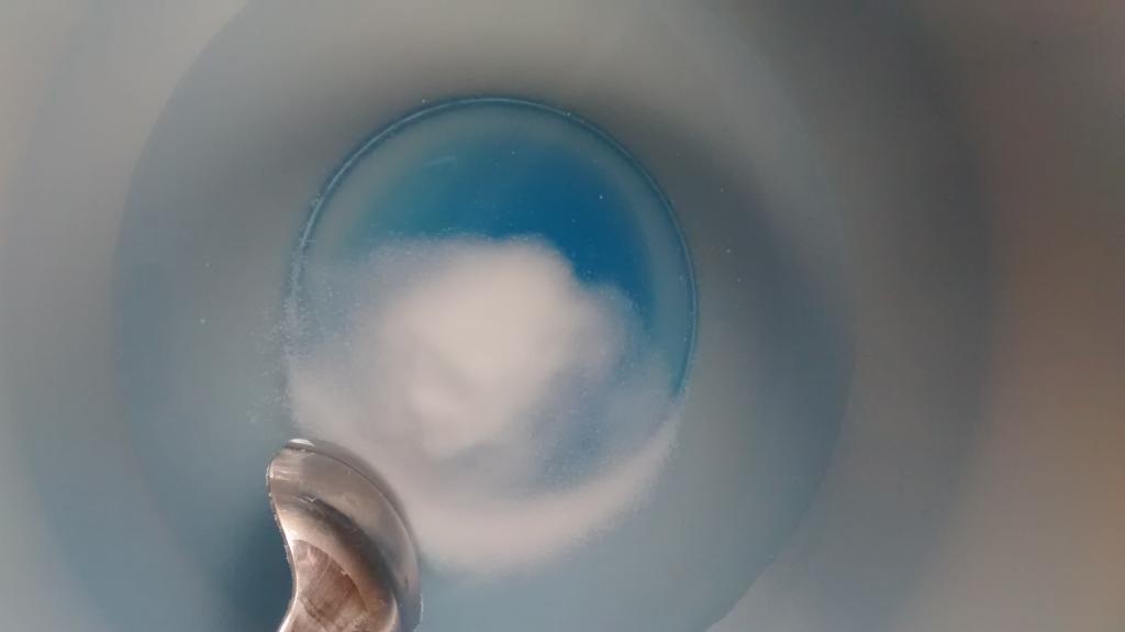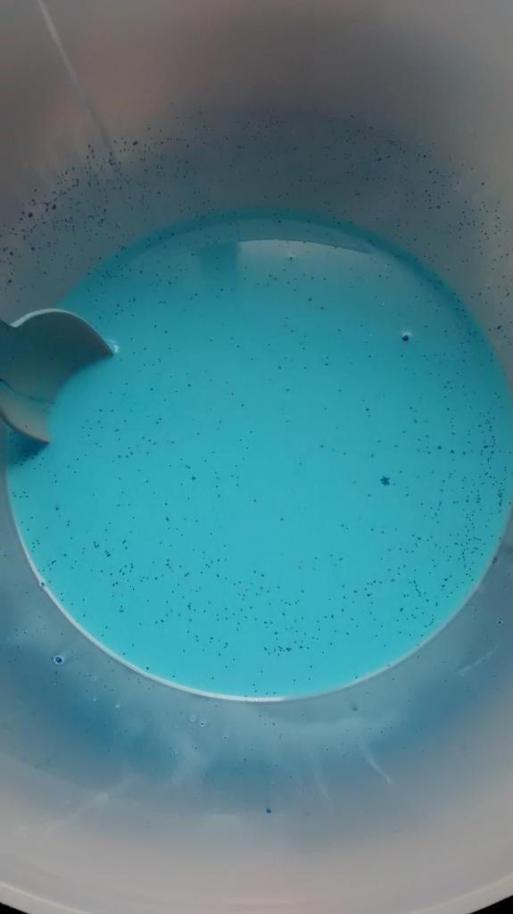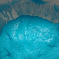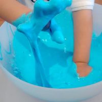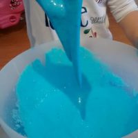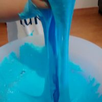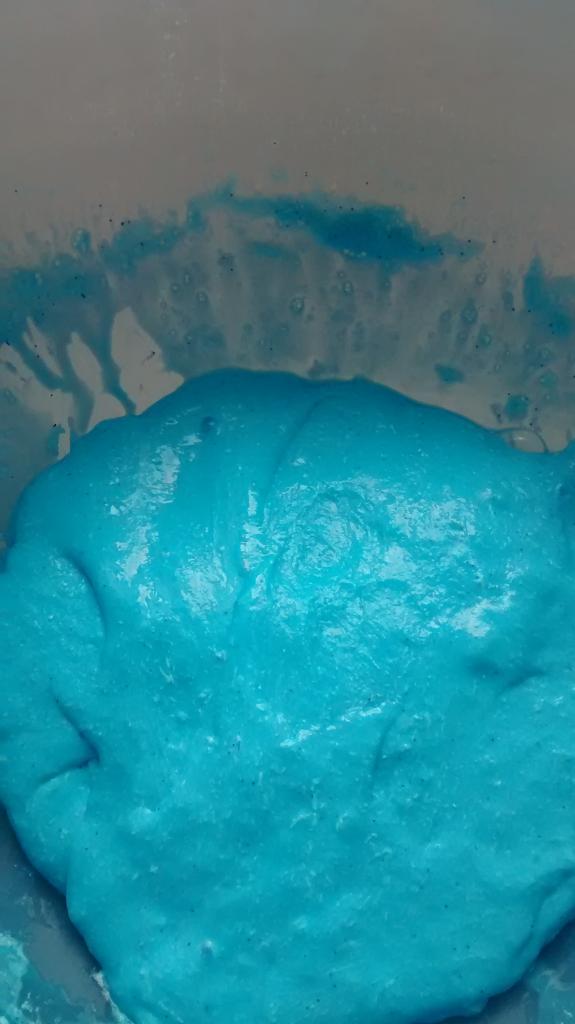 En otro recipiente mezclamos 2/3 de vaso de agua con una cucharada sopera de Bórax, cuando se haya disuelto bien, añadimos esta mezcla al recipiente con la mezcla de la cola, el colorante y la purpurina, removemos bien con una cuchara o con la mano, y en cuanto se vuelva la mezcla viscosa, ¡YA TENEMOS NUESTRO BLANDIBLÚ!