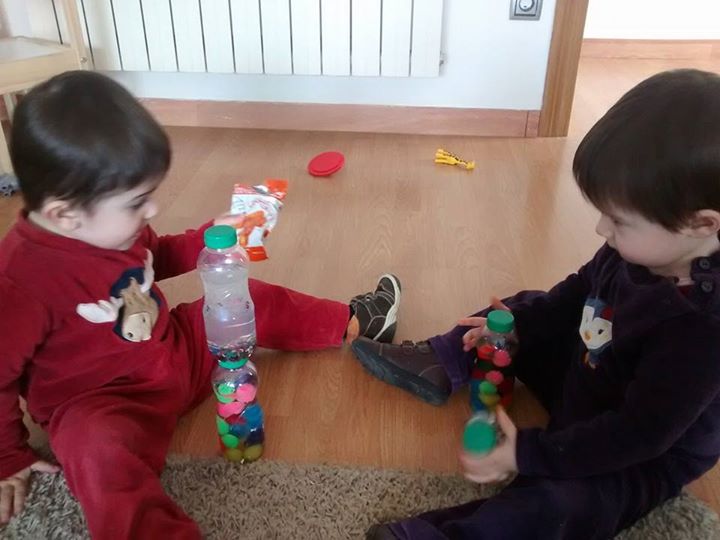 Se pueden introducir diversos materiales en las botellas, pero yo he hecho dos de cada tipo porque mis peques son mellizos y necesitan una para cada uno y he elegido esos materiales porque son los que tenia por casa. Aquí os dejo unas fotos de cómo han quedado.