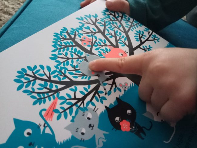 Hemos trabajado mucho la atención con este libro, ya que en las ilustraciones hay muchos gatos similares que pueden llegar a confundirse con Gala, de manera que el peque ha tenido que estar muy atento para descubrir cual era Gala.