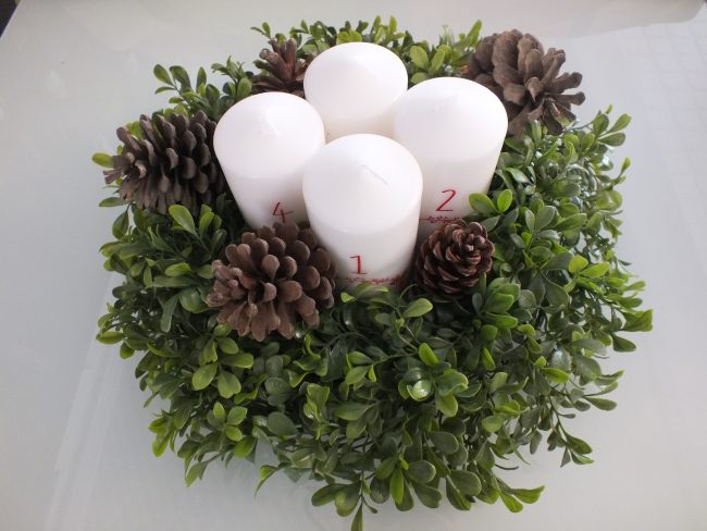Nuestra corona de Adviento tiene 4 velas (una por cada Domingo de Adviento, son de Ikea y vienen en un pack de 4 velas decoradas con los números 1-4 respectivamente).
