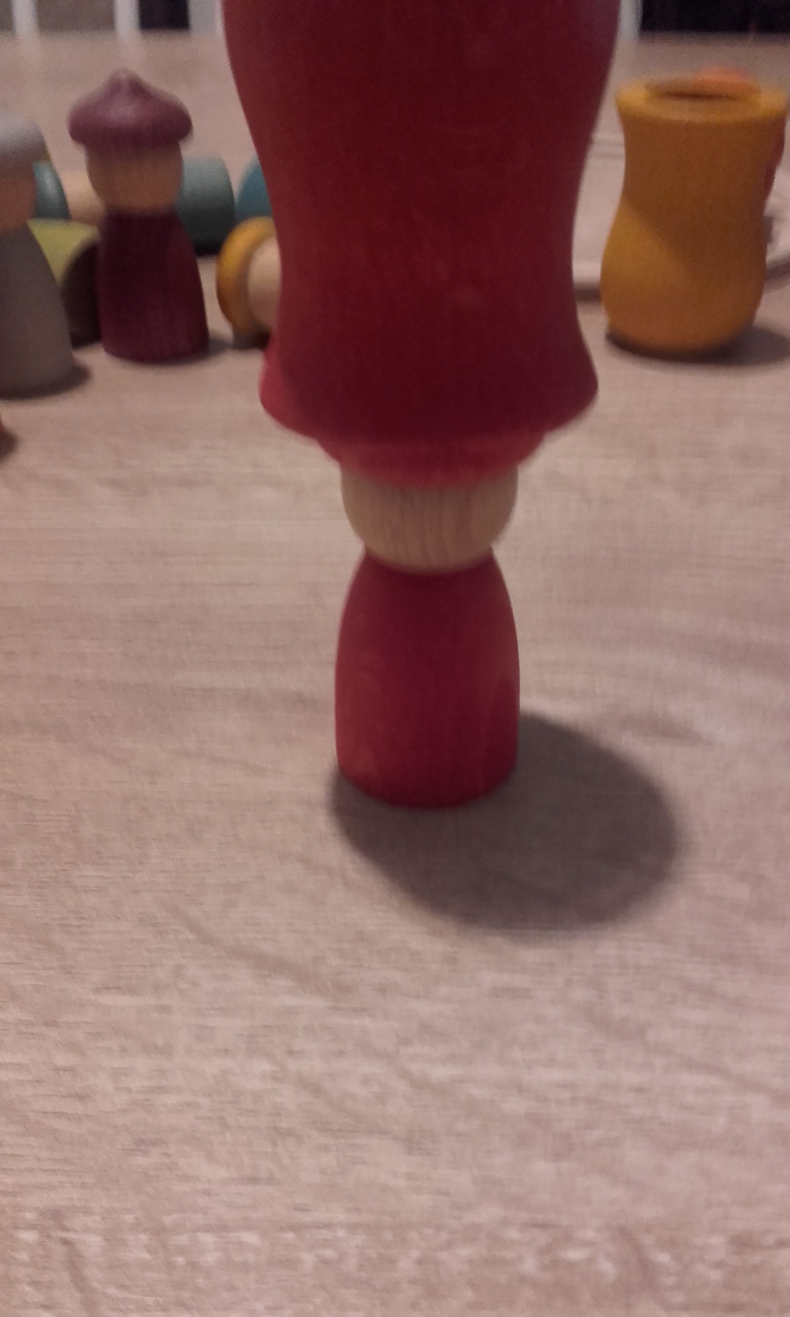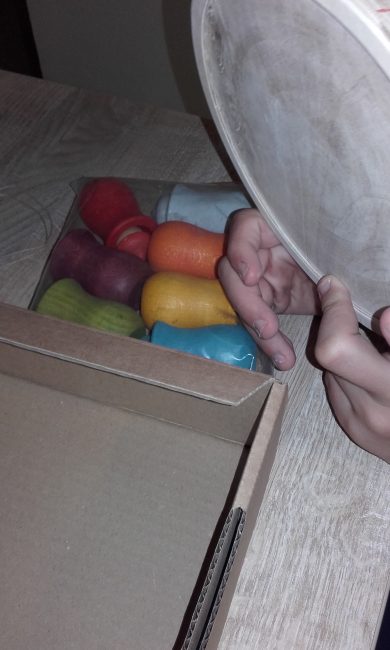 Y continuando por el calendario en sí, está compuesto por 7 nins-bellota y una base circular de madera donde colocarlos. Por la tarde nos sentamos a abrirlo y estábamos los dos emocionados. Lo primero que hicimos al abrir la caja fue jugar un rato con los nins-bellota, los tocamos (tan suaves y perfectos tal y como son), con esos colores maravillosos que no te dejan indiferente porque transmiten un paz y una tranquilidad que enganchan, con ese olor tan característico a madera. Cada cual más bonito, él enseguida se cogió el rojo y se puso a tocarlo, a meterlo y sacarlo de su cubilete, etc.