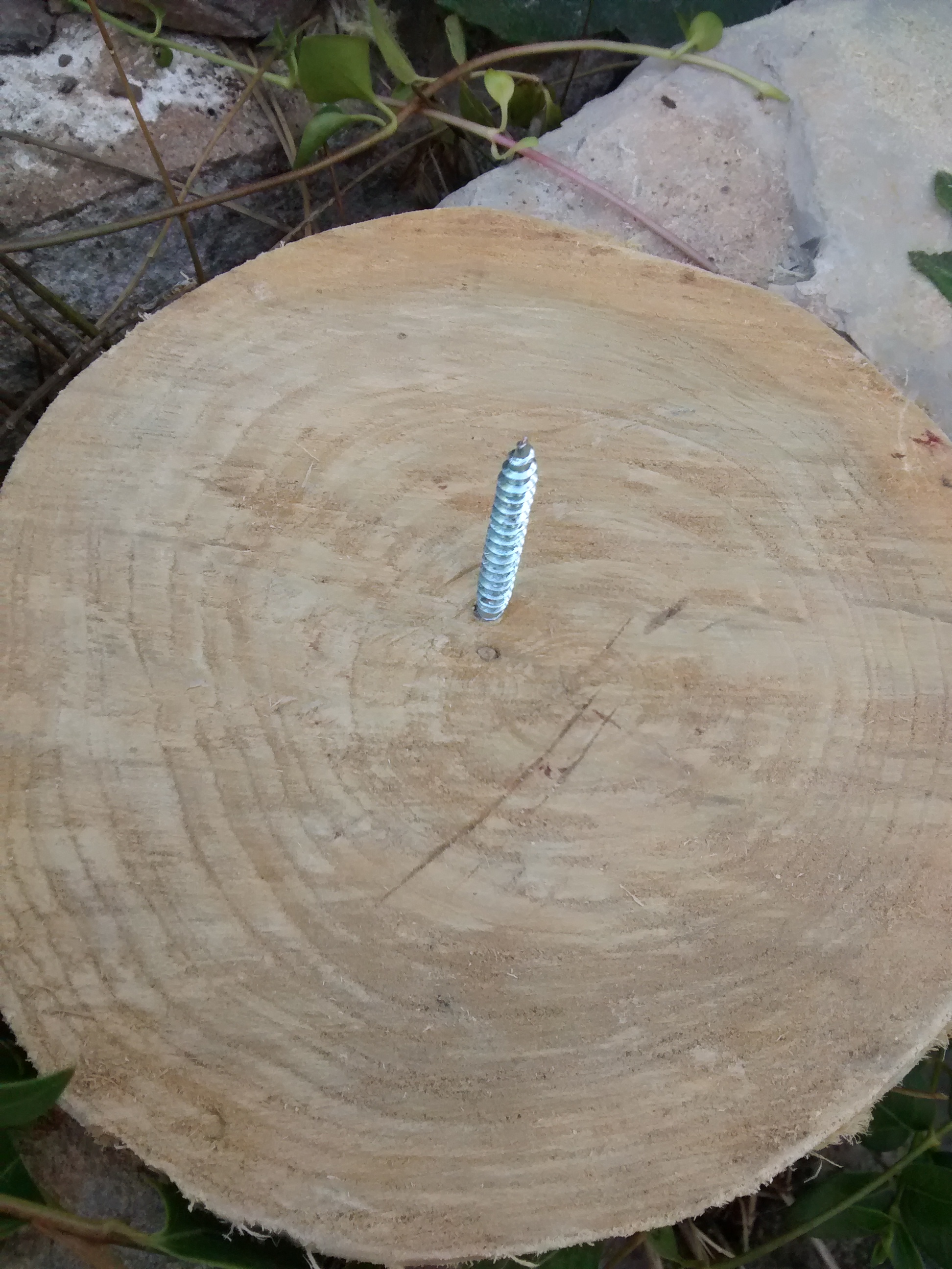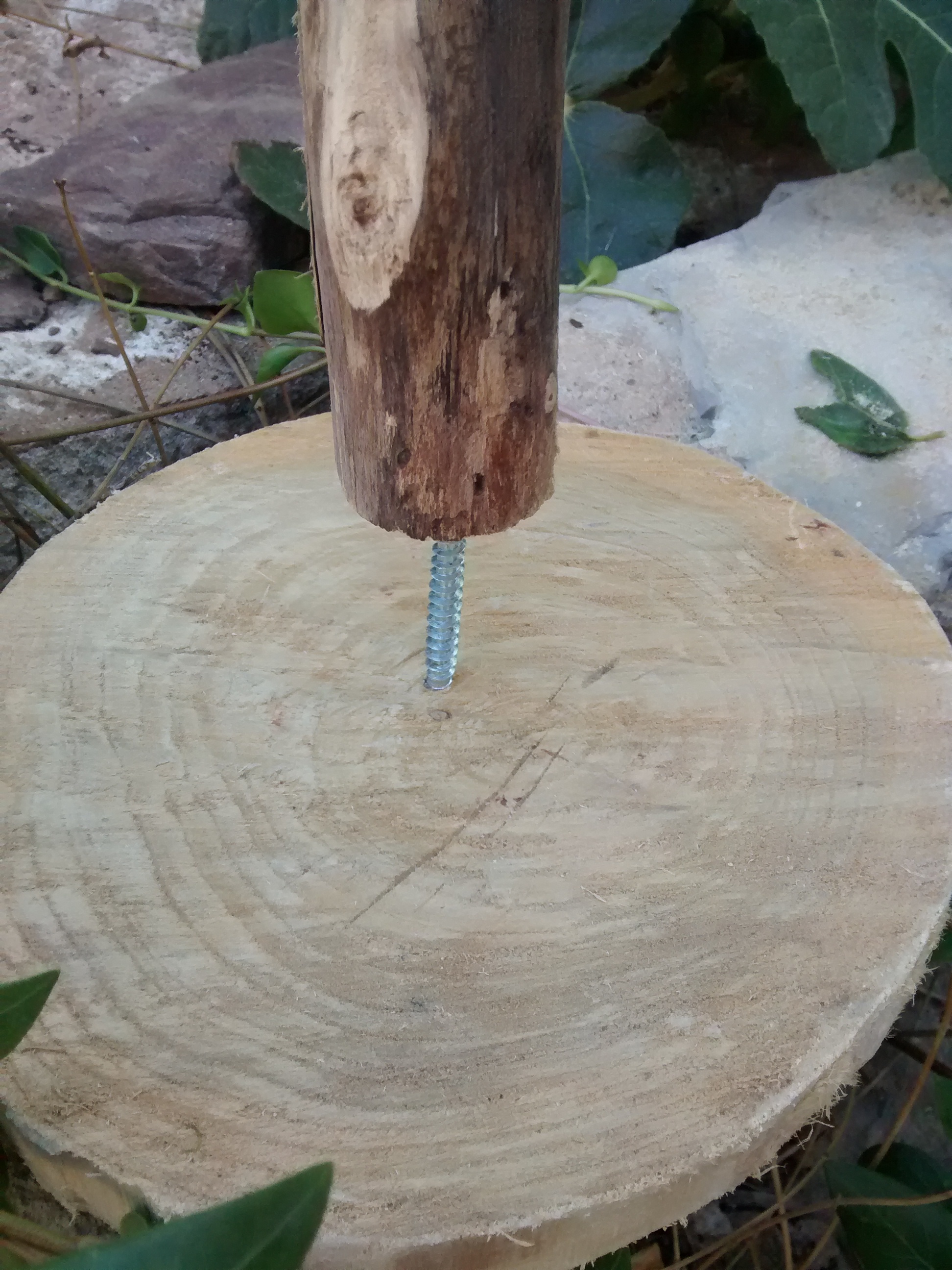 Una vez lijadas todas las partes, atornillamos el tornillo al centro de la base, atravesándola de manera que pudiera unir más tarde la rama del árbol que hace la función de eje vertical con la base de tronco horizontal.
