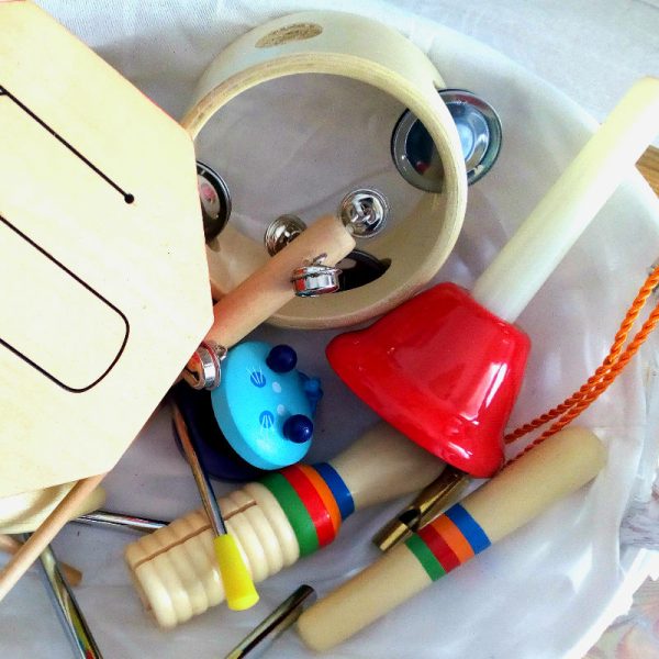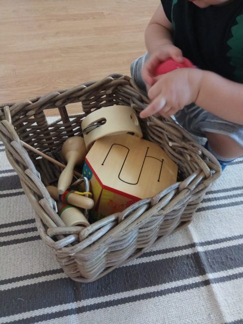 Como en casa tenemos niños de varias edades, hemos preparado un cesto de instrumentos musicales que puede ser utilizado tanto por el bebé como por los mayores, es este que os enseño aquí abajo. Está formado por: un tambor de madera, una maraca con cascabeles, un triángulo de metal, una pandereta de madera, un silbato de latón, una campana de metal ,una maraca tradicional, unas graciosas castañuelas en forma de animal, un cilindro de madera que es una maraca y un Güiro.