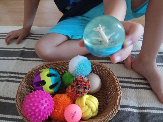 Fue sencillo,compramos una cesta de pelotas sensoriales con diferentes tipos de pelotas de distintos tamaños, colores, pesos y texturas, le añadí algunas que tenemos en casa, y se la presenté al peque. Comenzamos tocando, oliendo y jugando cada una de las pelotas.