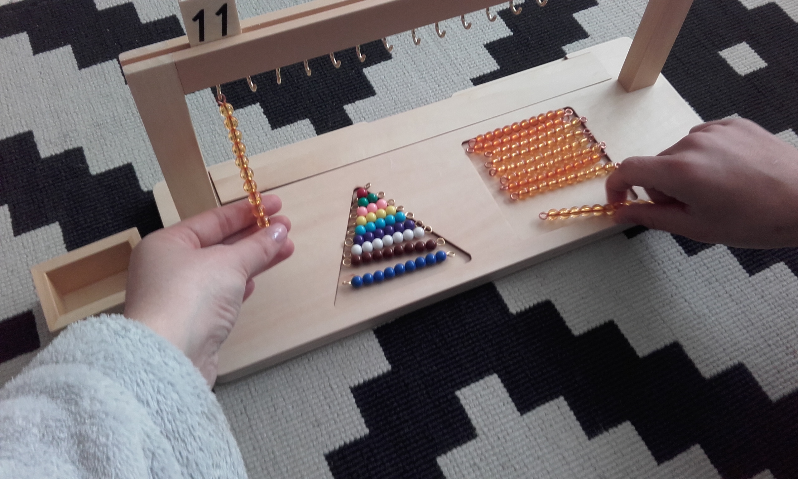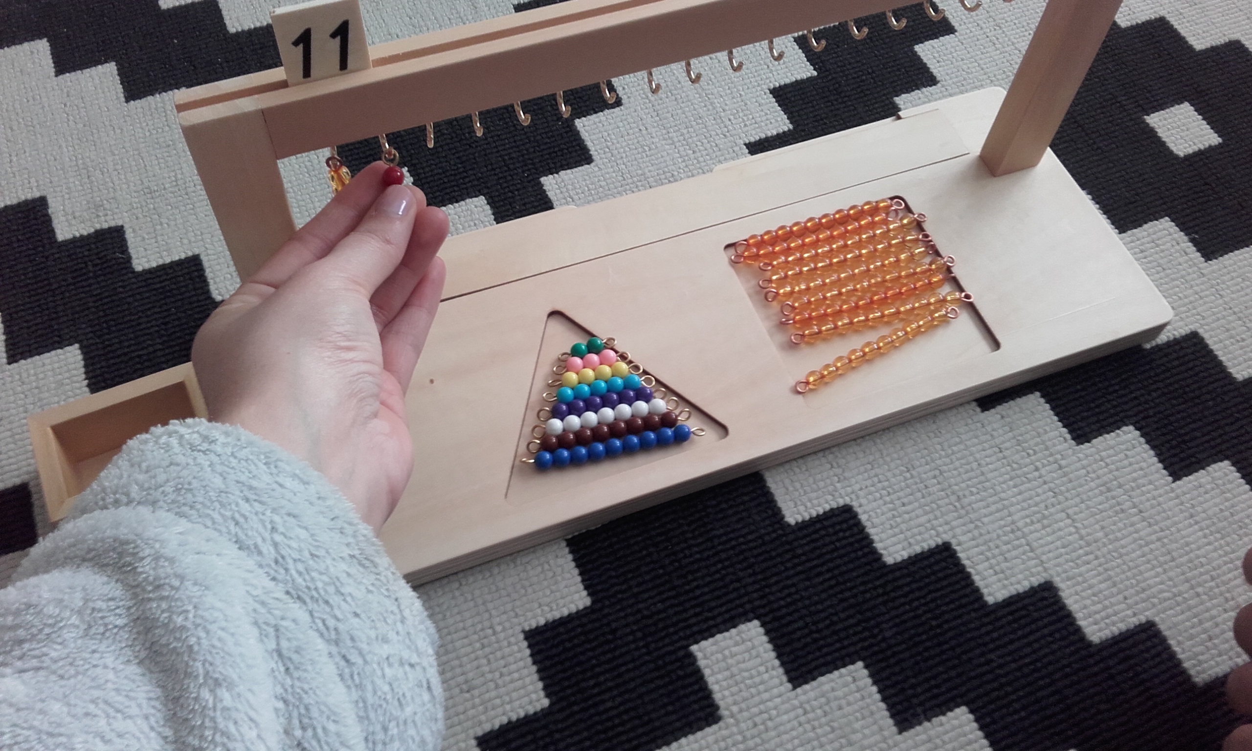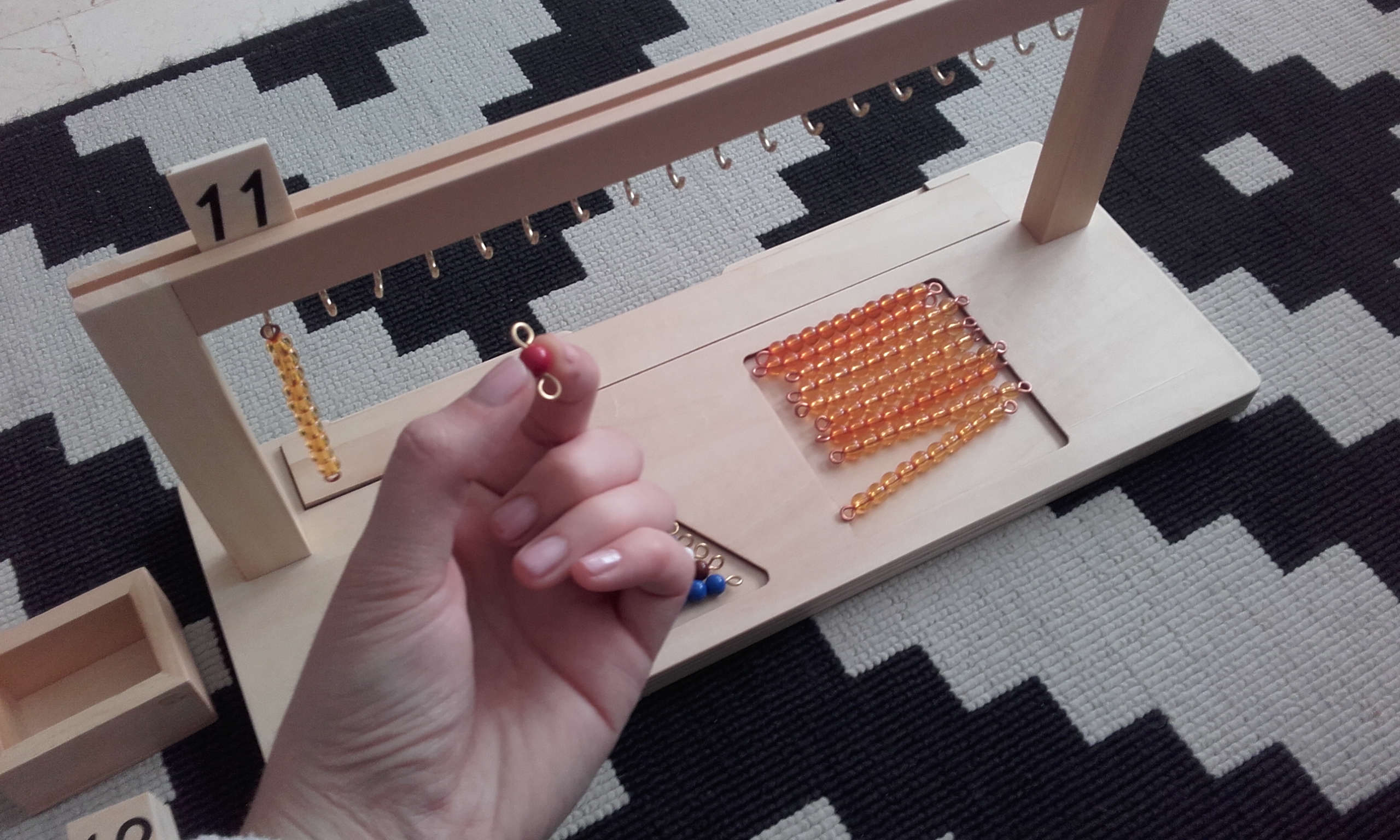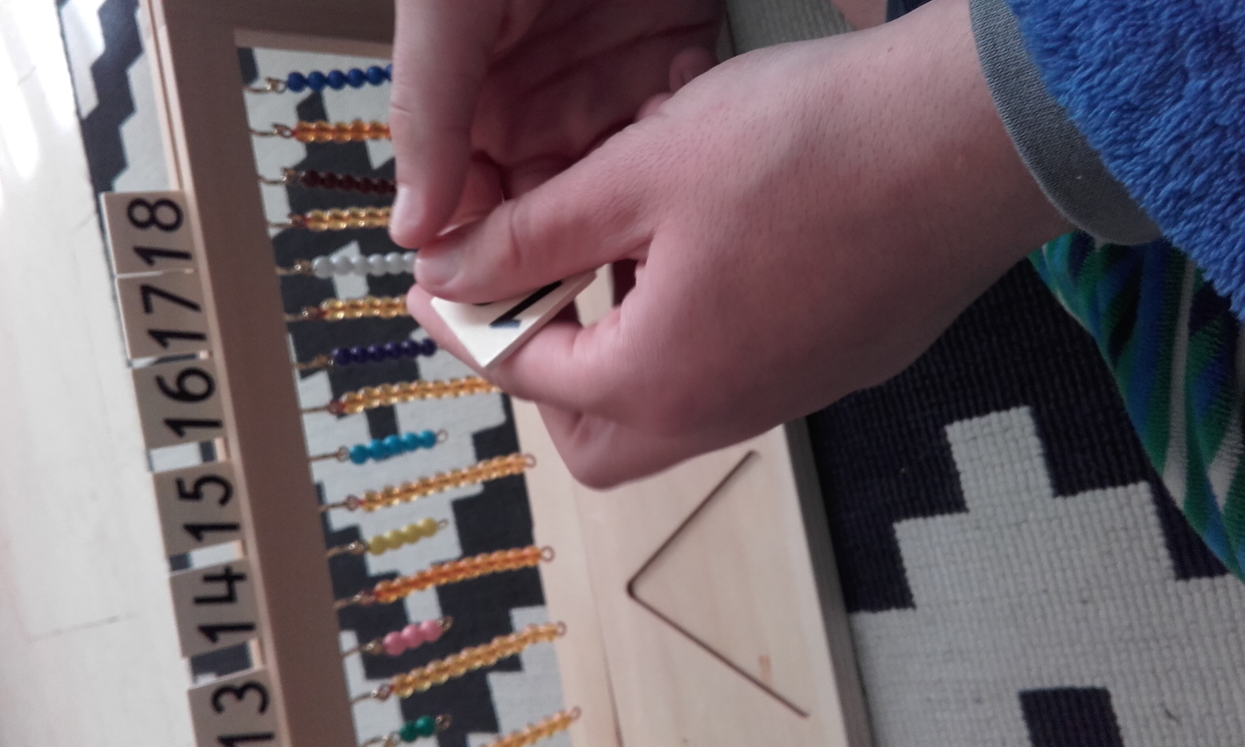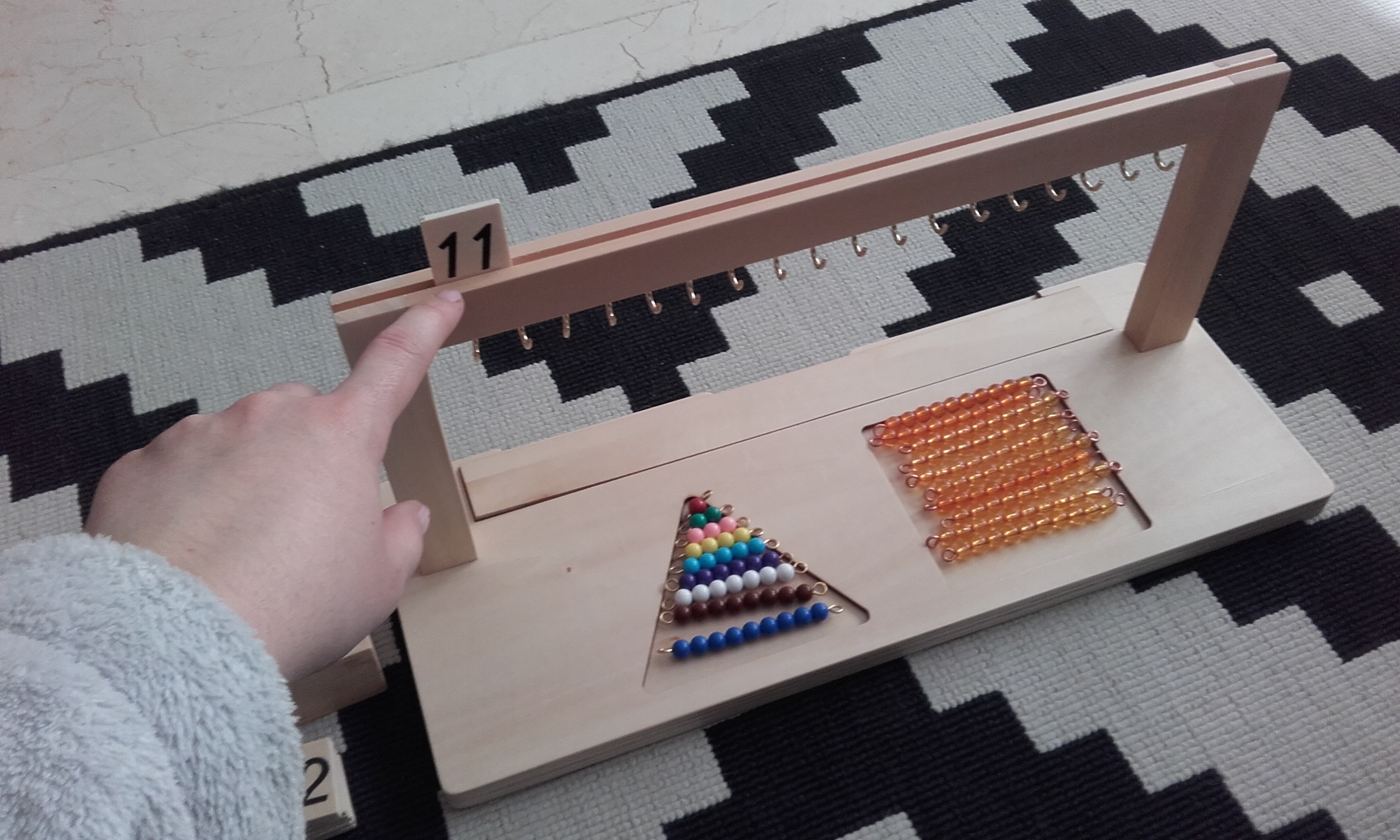 He puesto la ficha del 11 en la guía. He señalado con el dedo y he dicho 11. Después he cogido una decena y he dicho «diez» y la he colgado en el primer gancho. Luego he cogido la perla que corresponde al 1 y he dicho «uno», la he colgado en el siguiente gancho.