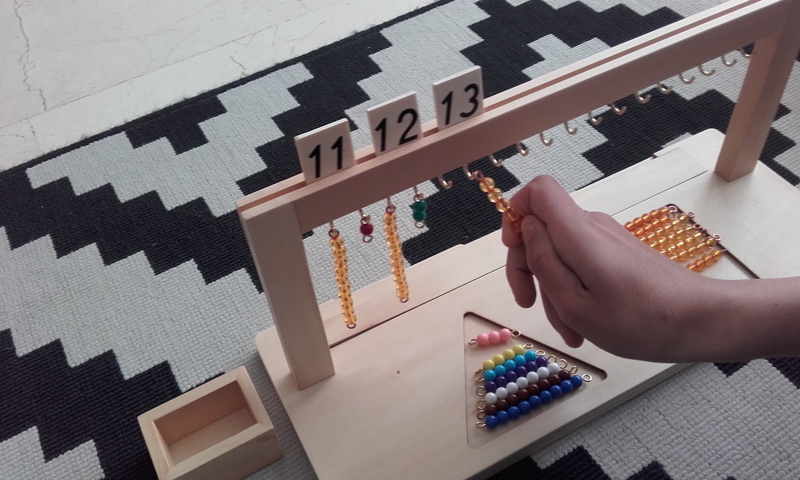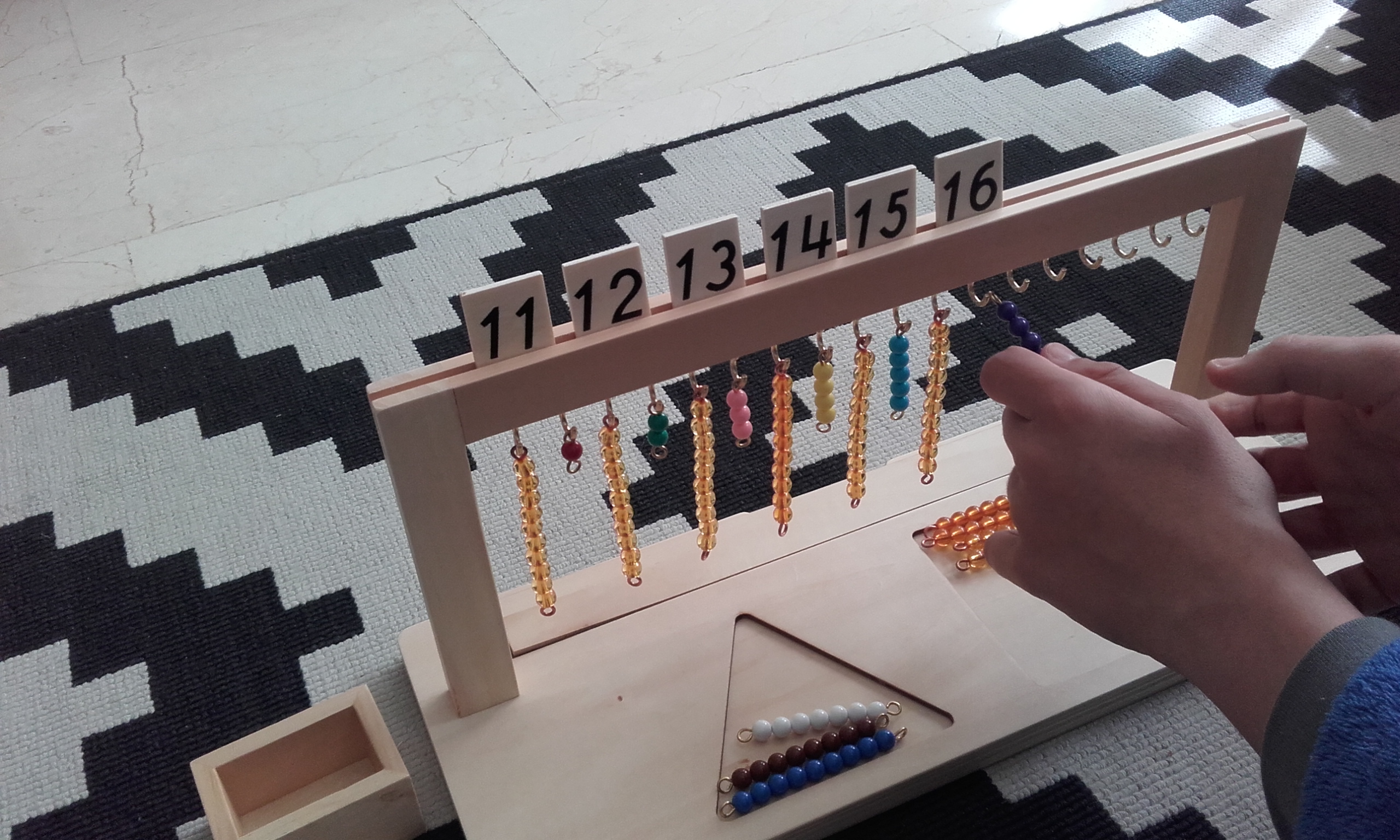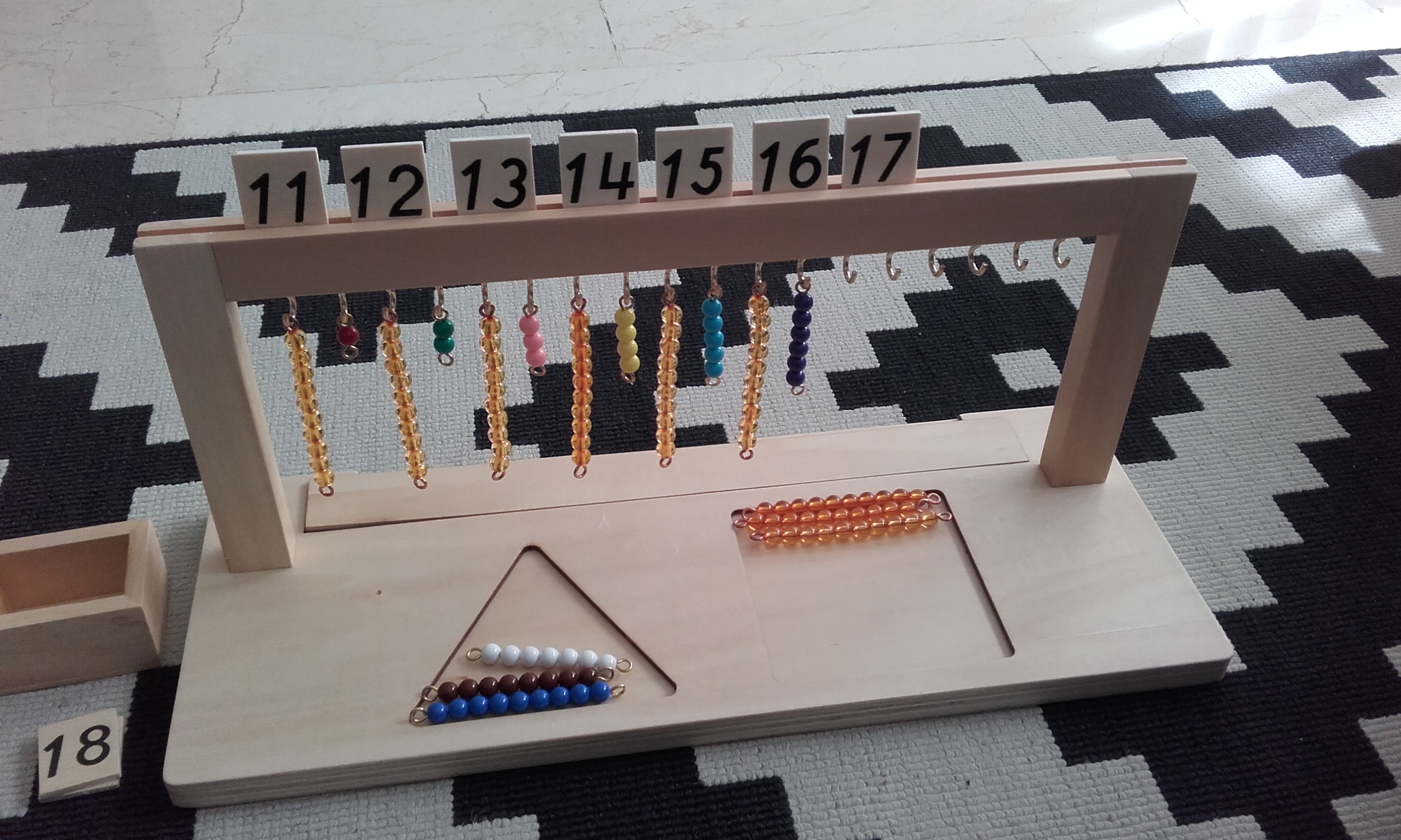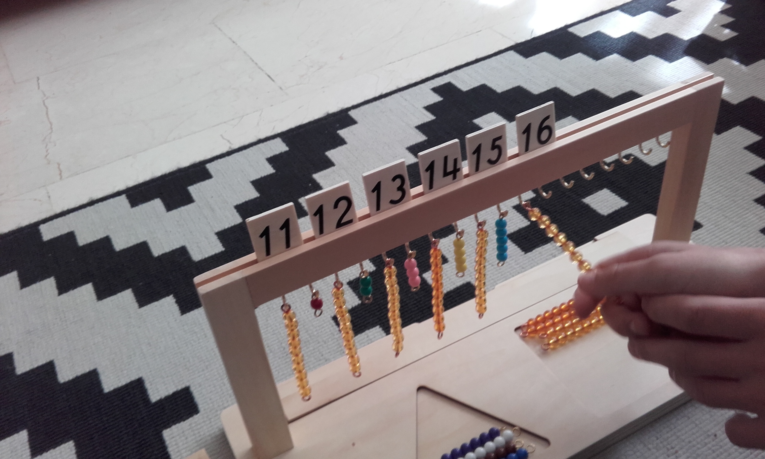 Después de haber trabajado durante varios días la unidad, decena, centena y millar, y sin dejar de trabajar con las barras numéricas, han llegado los números del 11 al 19. ¡Me encanta! ¡Si me lo dicen en septiembre, no me lo creo! Hemos trabajado con el colgador de perlas Montessori.