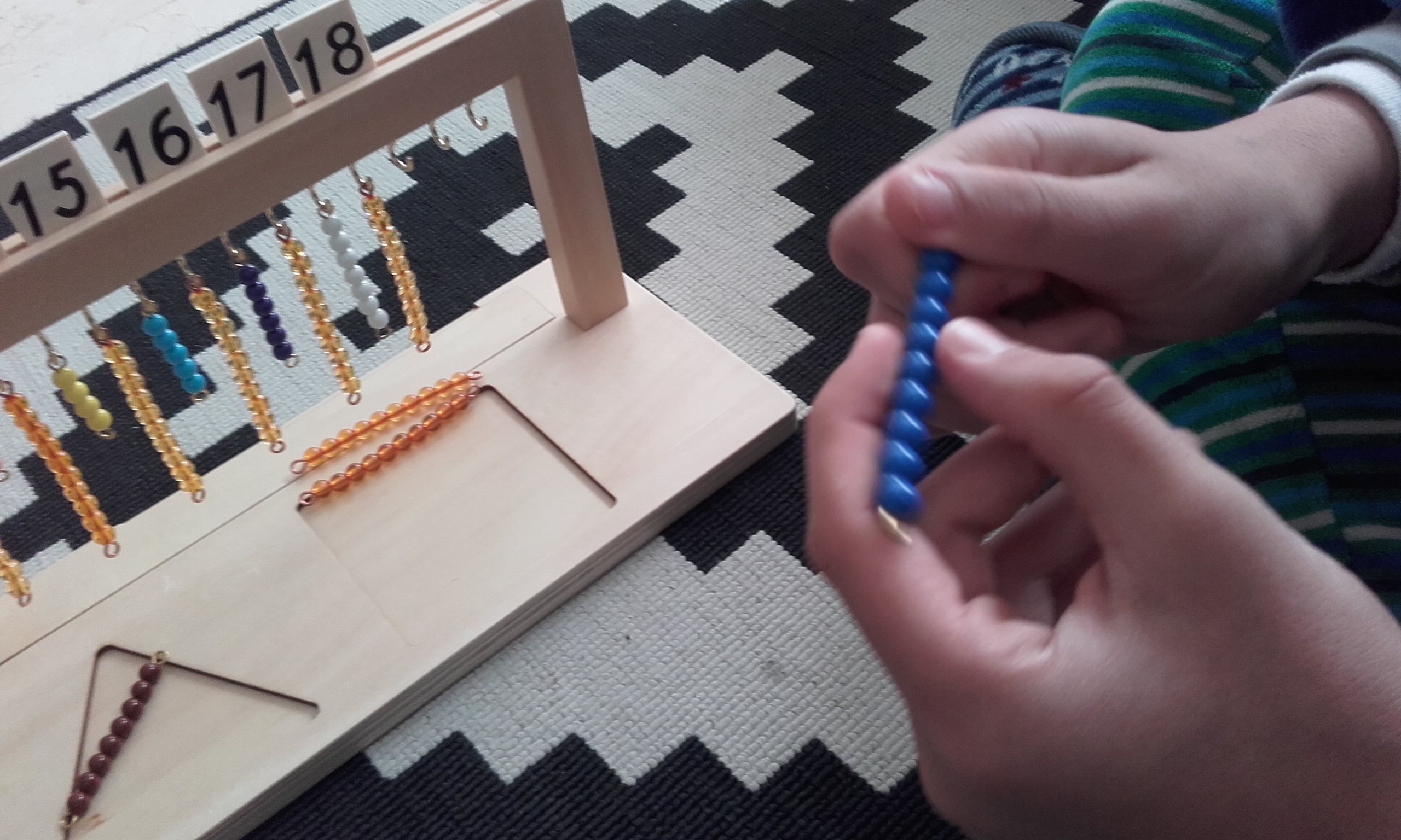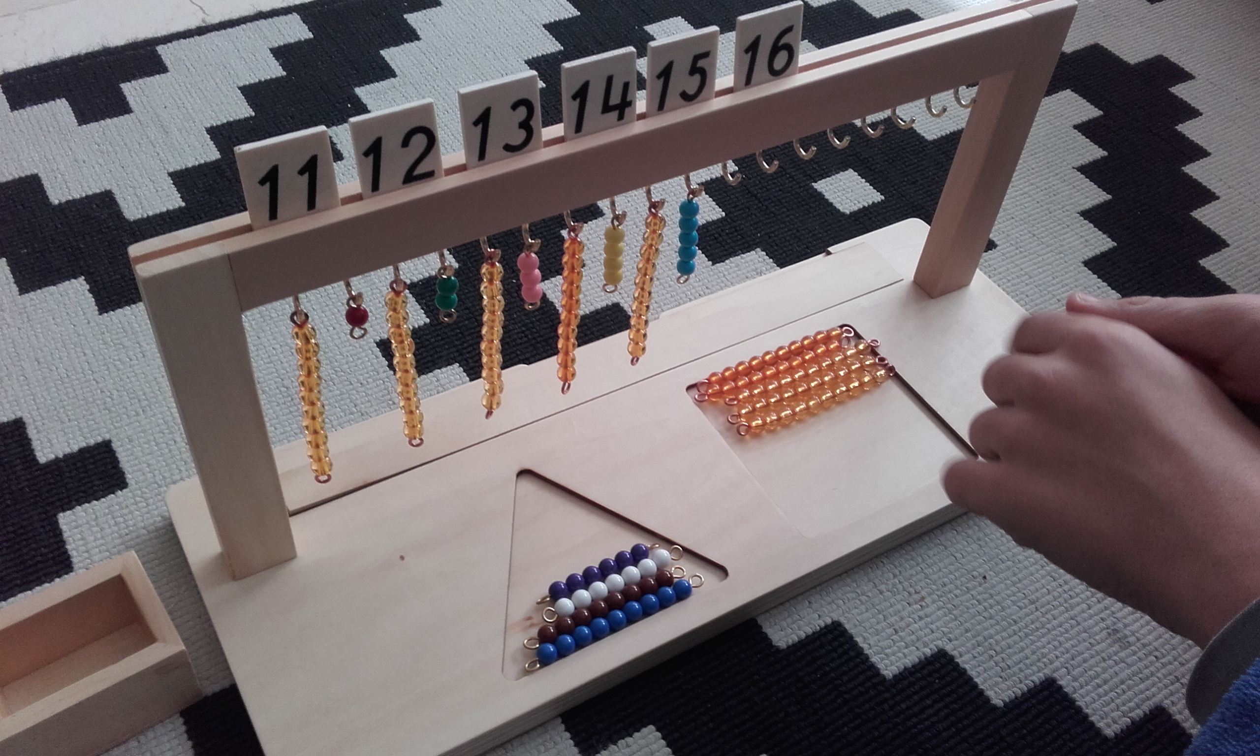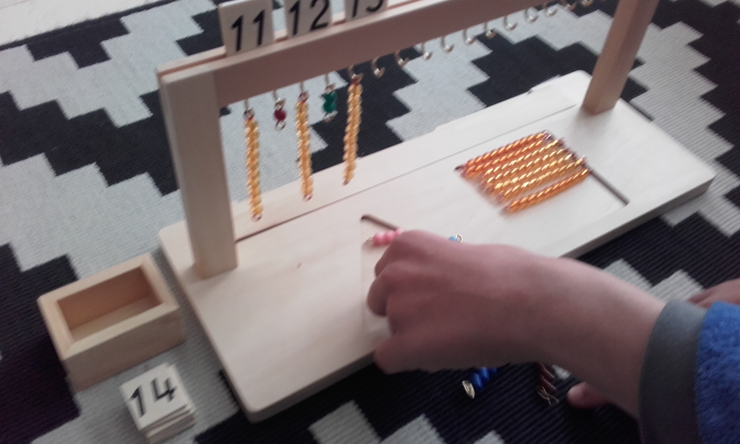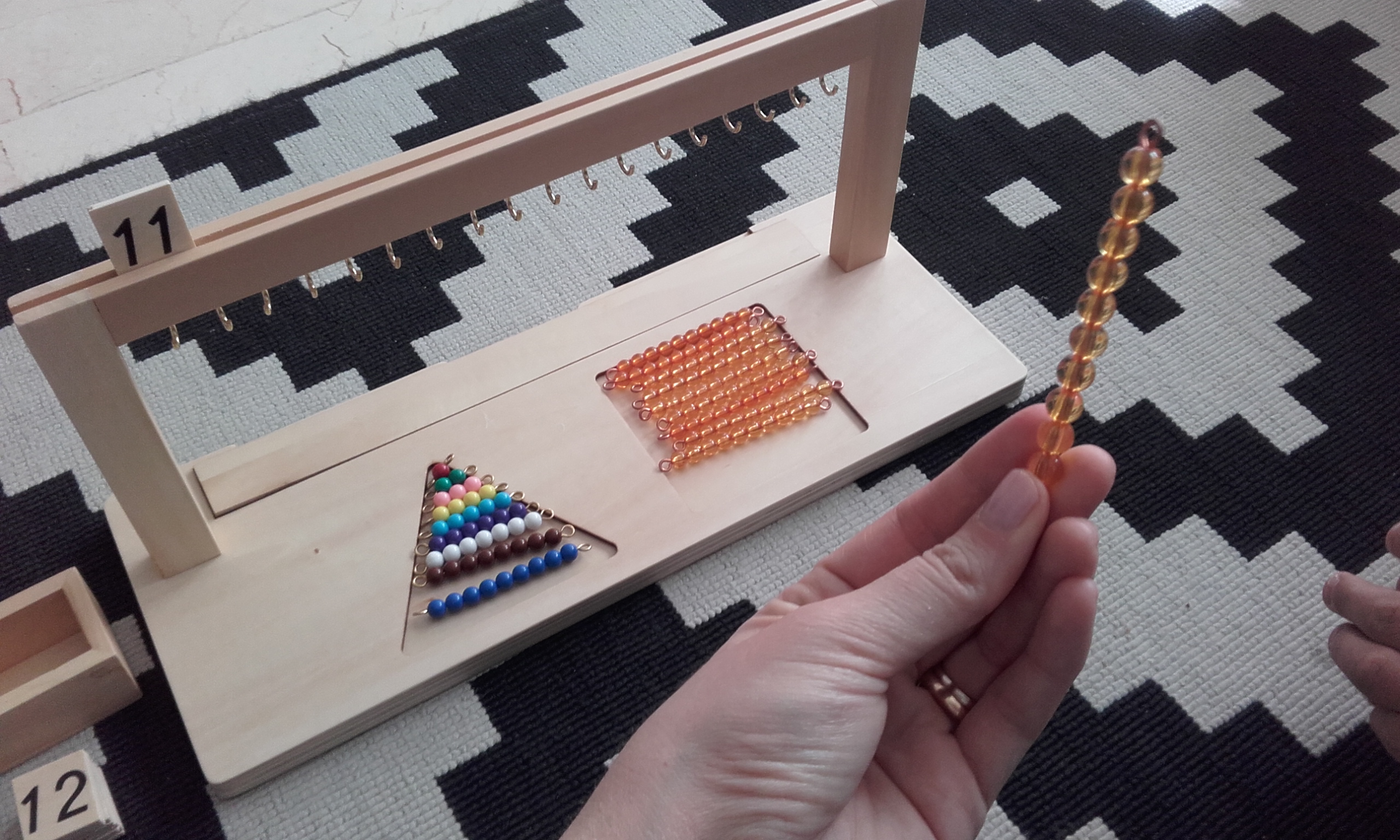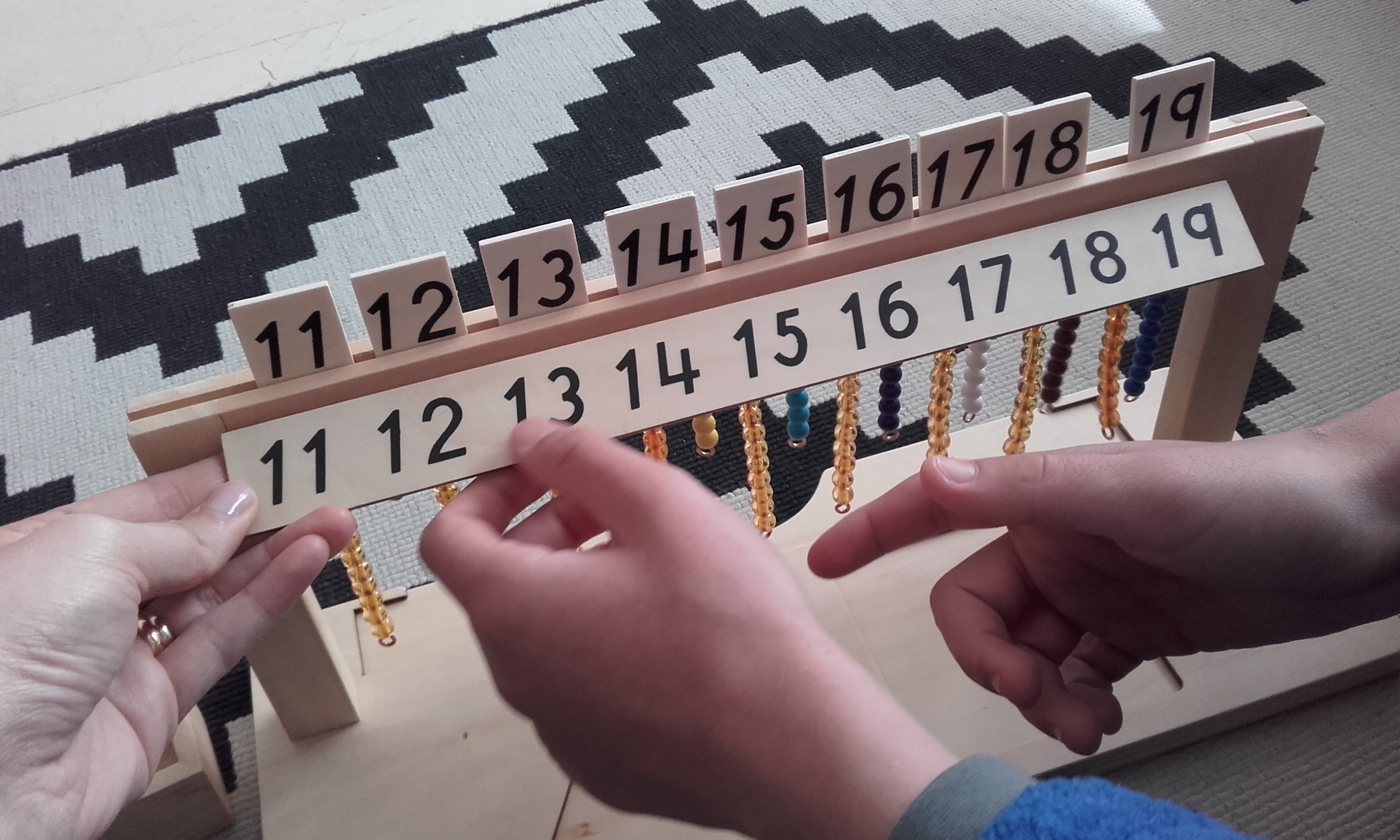 Después de haber trabajado durante varios días la unidad, decena, centena y millar, y sin dejar de trabajar con las barras numéricas, han llegado los números del 11 al 19. ¡Me encanta! ¡Si me lo dicen en septiembre, no me lo creo! Hemos trabajado con el colgador de perlas Montessori.