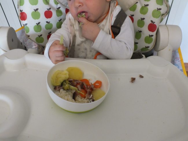 Actualmente, con 10 meses creo que lo único que todavía no ha probado es el azúcar/miel, la clara de huevo y el pescado azul, porque el resto de alimentos los va probando día a día. Come lo mismo que nosotros, pero sin sal y come lo que le apetece (porque de momento, y ojalá dure mucho más, la LME es su principal alimento, el resto es complementario). Disfruta tanto comiendo el sólo, experimentando, probando nuevos sabores y texturas…