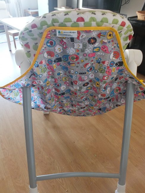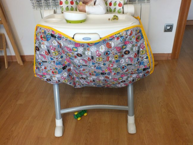 Se puede lavar en lavadora y se seca muy rápido gracias al tejido con el que está fabricado (PUL), además, se fija a la trona con belcro adhesivo, así que más fácil imposible.