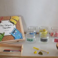 Coloqué en una mesa unos botes vacíos con etiquetas con el nombre de cada sentimiento y el color de ese sentimiento de fondo, os dejo aquí las etiquetas (están en inglés).