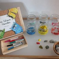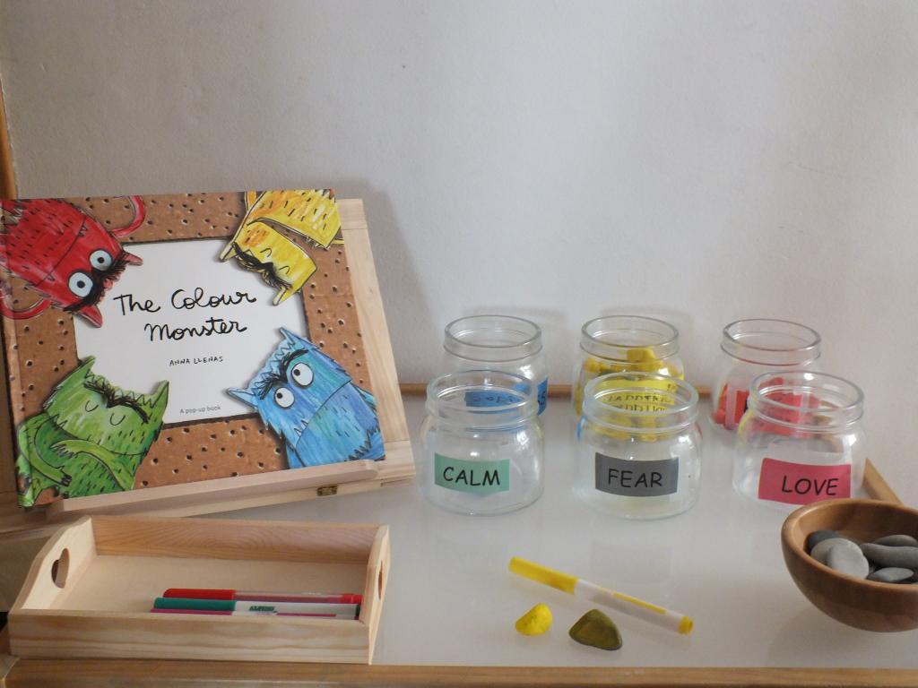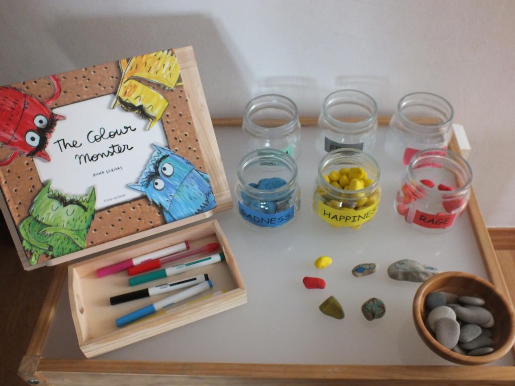 Al día siguiente, preparé una mesa donde les puse un cuenco con piedras, rotuladores de los colores de cada emoción, el libro del Monstruo de colores pop up y los botes vacíos.