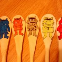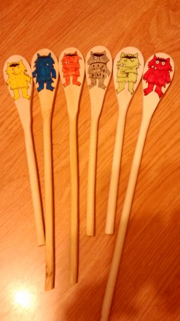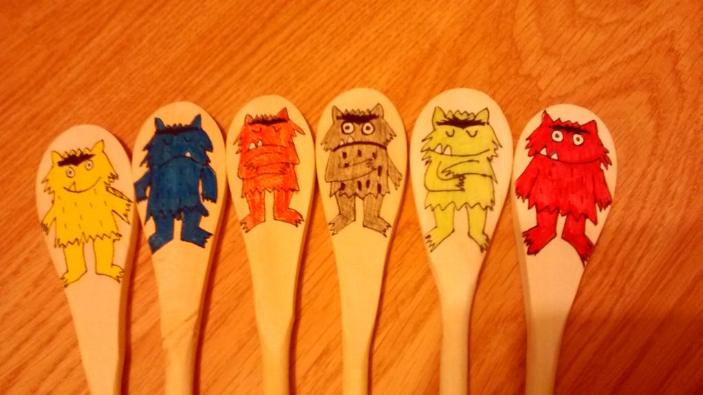 Dibujé en unas cucharas de madera cada uno de los monstruos de colores, las pinté y luego se las di a los niños para contar el cuento, mientras recordábamos cada sensación y cada color por ejemplo, “la calma es verde”.