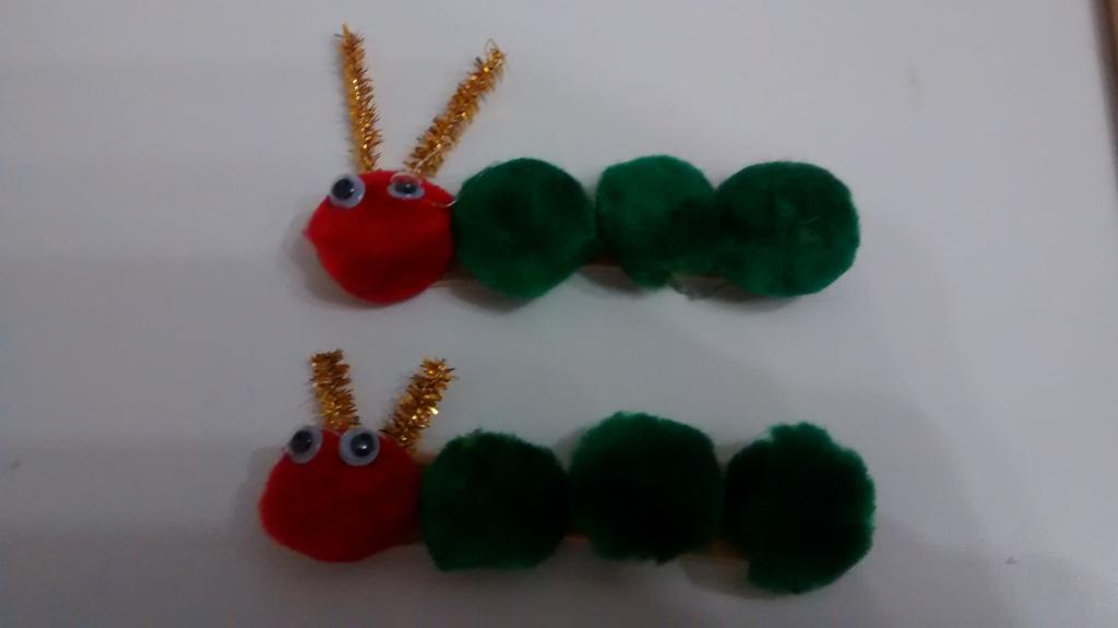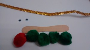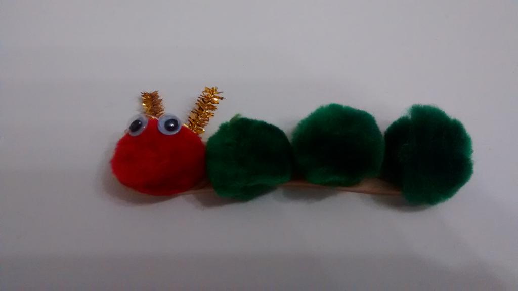 He pegado en el palito de helado un trocito de limpiapipas con forma de V imitando las antenas de la oruga glotona. Sobre las antenas, pegamos el pompón rojo a modo de cabeza el primero y el resto de pompones verdes a modo de cuerpo a continuación del rojo. Finalmente, pegamos los ojos móviles con dos gotitas de cola y ¡ya tenemos nuestras orugas glotonas!