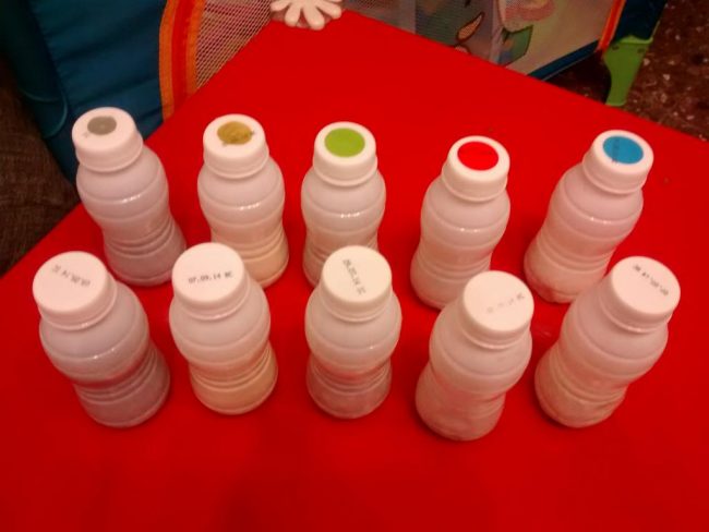 Son botellas tipo actimel del Aldi o Lidl. Las limpié, las llené de arena, sémola, arroz, garbanzos y lentejas. Hay dos botellas con idéntico contenido (la misma cantidad) de cada tipo, de cada pareja de botellas, una lleva un gomet o circulo con rotulador permanente de color en el tapón y la otra lleva la misma marca que la del tapon pero solo en la base de la botella, de esta manera son autocorrectivas, porque el niño coge la botella del tapón azul, por ejemplo y la hace sonar, luego hace lo mismo con las que llevan la marca en la base pero sin ver el color, y tiene que asociarlas.