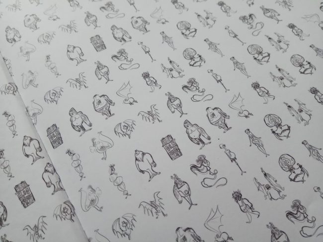 En lo segundo en lo que me suelo fijar al tener un libro en las manos (en lo primero que me fijo es en la portada) es en las guardas y estas me encantan, están los dibujos de los monstruos en miniatura y en lápiz.