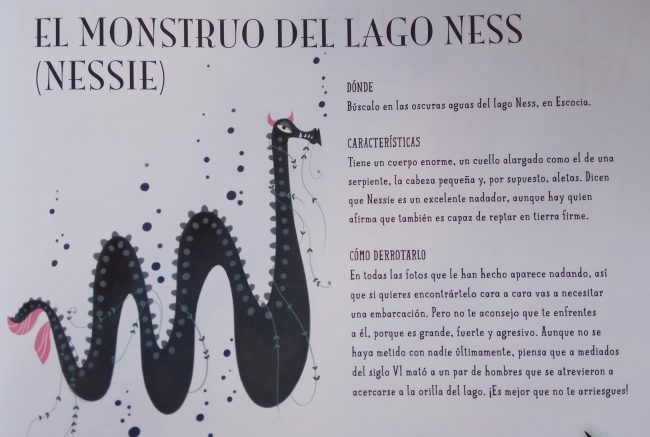 La autora hace una clasificación y explicación muy exhaustiva de multitud de criaturas sin dejar ningún continente por recorrer y viajando por mares, océanos, montañas, lagos, edificios… Los textos vienen acompañados de unas ilustraciones realmente coloridas, vistosas y divertidas y, aunque son bastante fieles a las descripciones o imágenes que podemos conocer de algunos monstruos, son muy graciosas y no dan miedo a los niños.