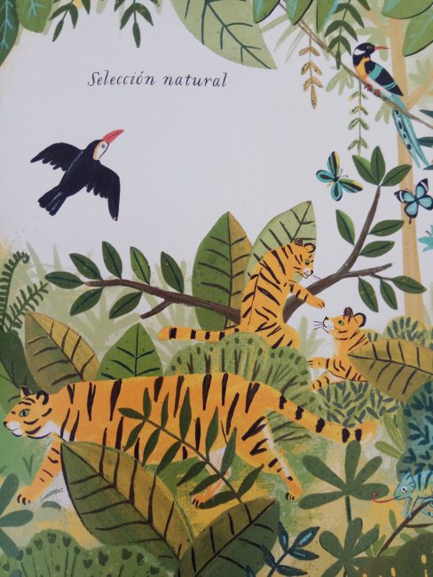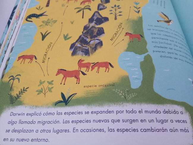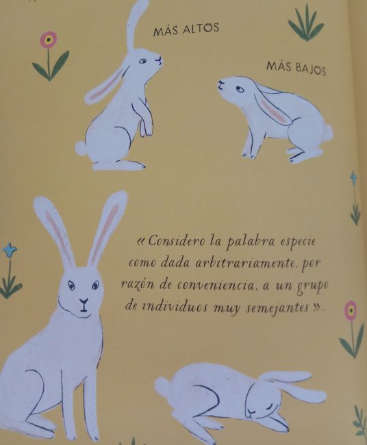 Hay algo que me parece muy importante e interesante en una adaptación como esta y es que a lo largo de las 64 páginas, la autora va infiriendo citas de Darwin fieles al texto original para explicar o definir diferentes conceptos, ejemplificándolas con ilustraciones que facilitan la comprensión.