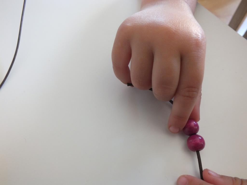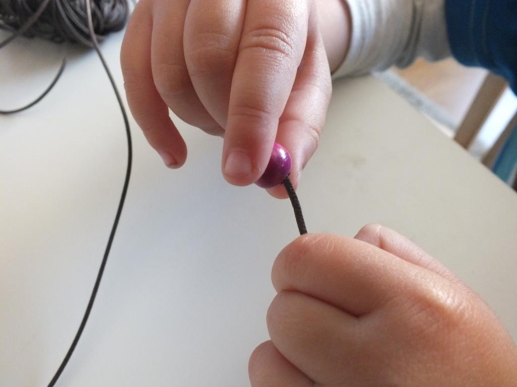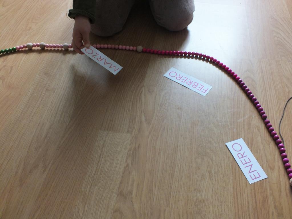 Cada día que pasa los niños han ido pasando una bolita por el cordón que compramos (9 metros de cordón), teniendo cuidado de contar las bolitas varias veces para no equivocarnos en el número de días de cada mes e introduciendo las bolitas más grandes cuando ha sido necesario señalar un día especial.