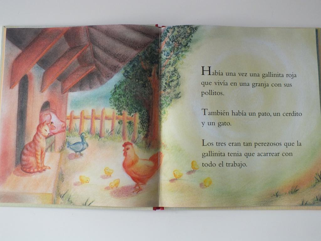 Ambos cuentos son de inspiración Waldorf, resalta en las ilustraciones tan bonitas que contienen. El de «La gallinita roja» tiene moraleja, trata de una gallina y sus pollitos que encuentran unos granos de trigo, los siembran, cosechan, etc y finalmente cuecen pan con la harina obtenida de ellos, pero los otros animales del cuento quieren aprovecharse de su trabajo.