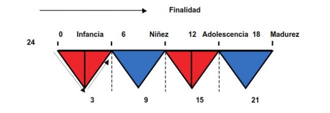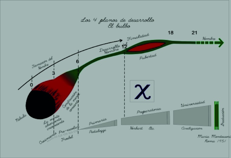 Montessori representó las etapas por las que pasa un niño a lo largo de la vida en un dibujo geométrico que llamó “El ritmo constructivo de la vida” donde podemos observarla evolución de cada periodo de desarrollo.