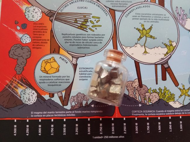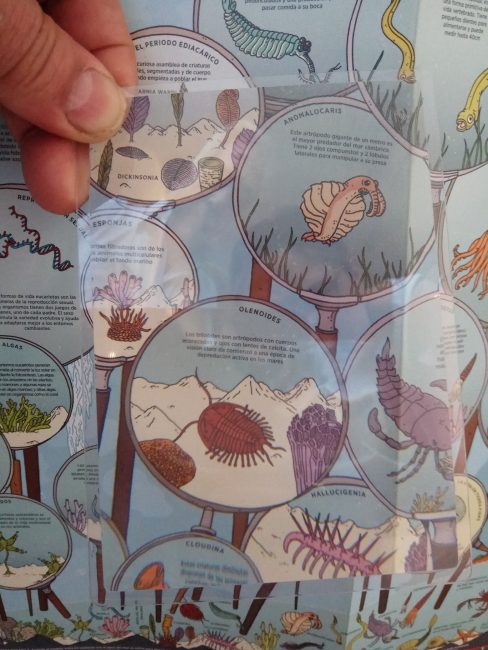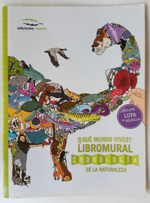 ¿En qué mundo vives? es una línea del tiempo de dos metros de longitud que se pliega para estar protegida dentro de las tapas del libro. Nada más abrir el libro hay una lupa cuadradita y muy cómoda para poder leer con facilidad los textos con letra pequeña y las ilustraciones con todo lujo de detalle.