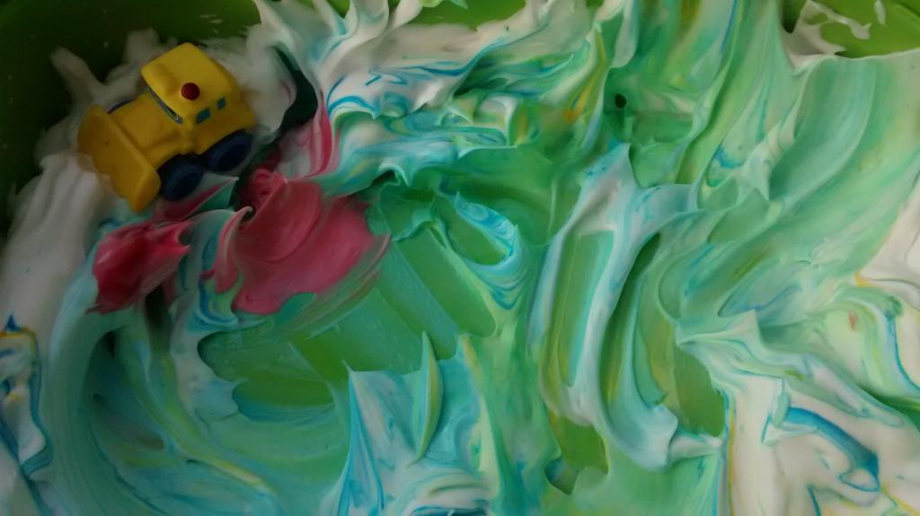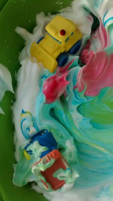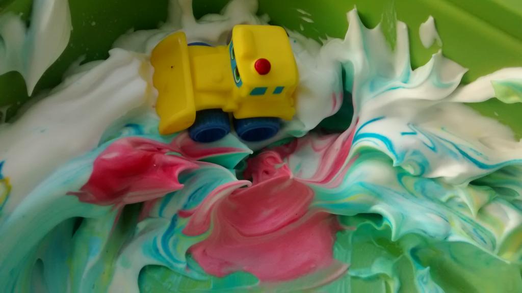 Después, decidieron poner unos coches de juguete en la espuma y decían que estaban en la nieve, los estuvieron «rescatando» de la nevada.