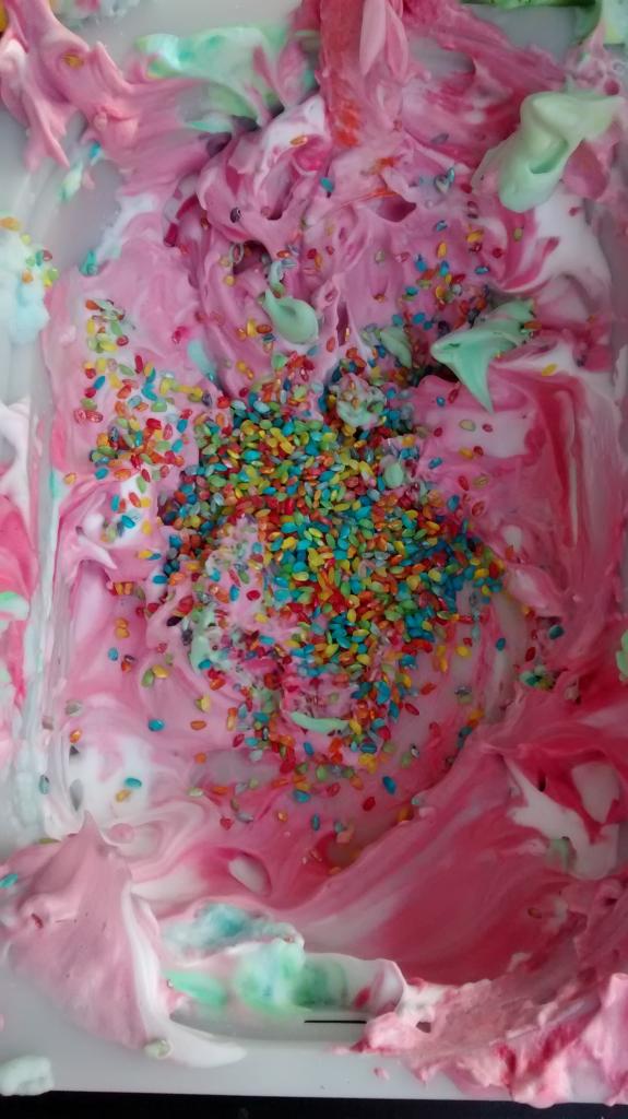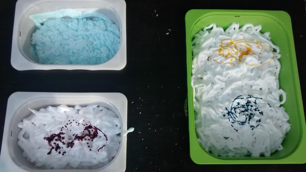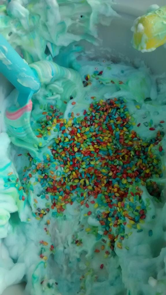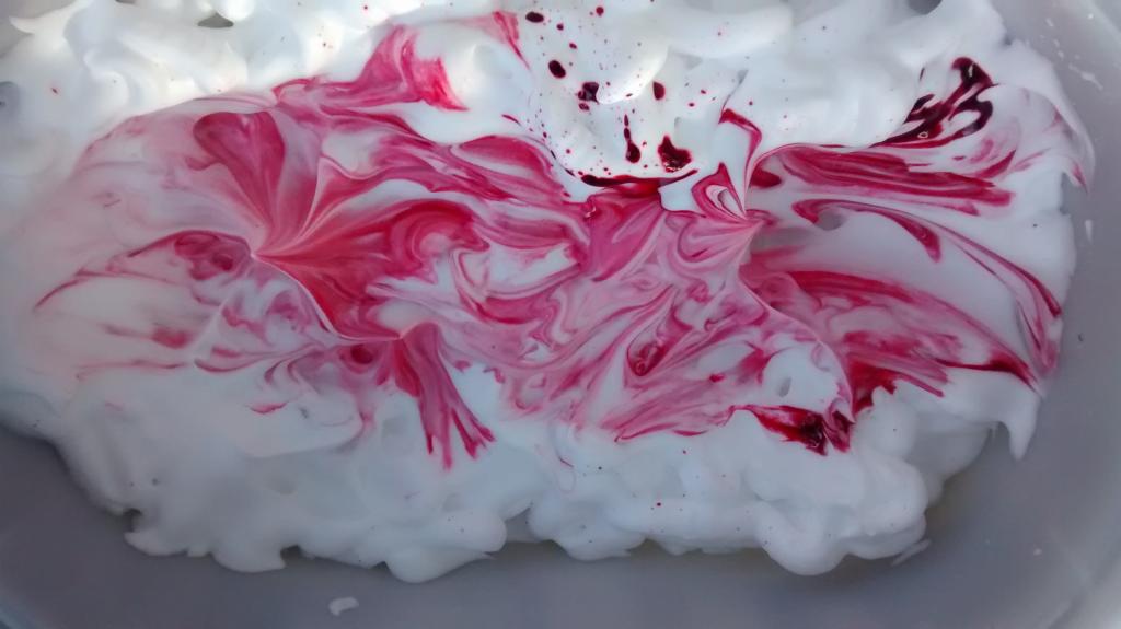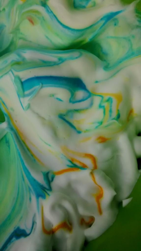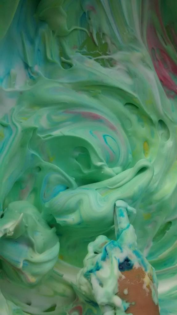 A los niños les encantó la mezcla de todos los colores y experimentar con el aspecto que tenía en diferentes colores. He añadido unos 10 a 15 gotas de colorante de alimentario para cada color. Se divirtieron mucho al mezclar todo. Aquí podéis ver catorce fotos del proceso de mezclado de colores.
