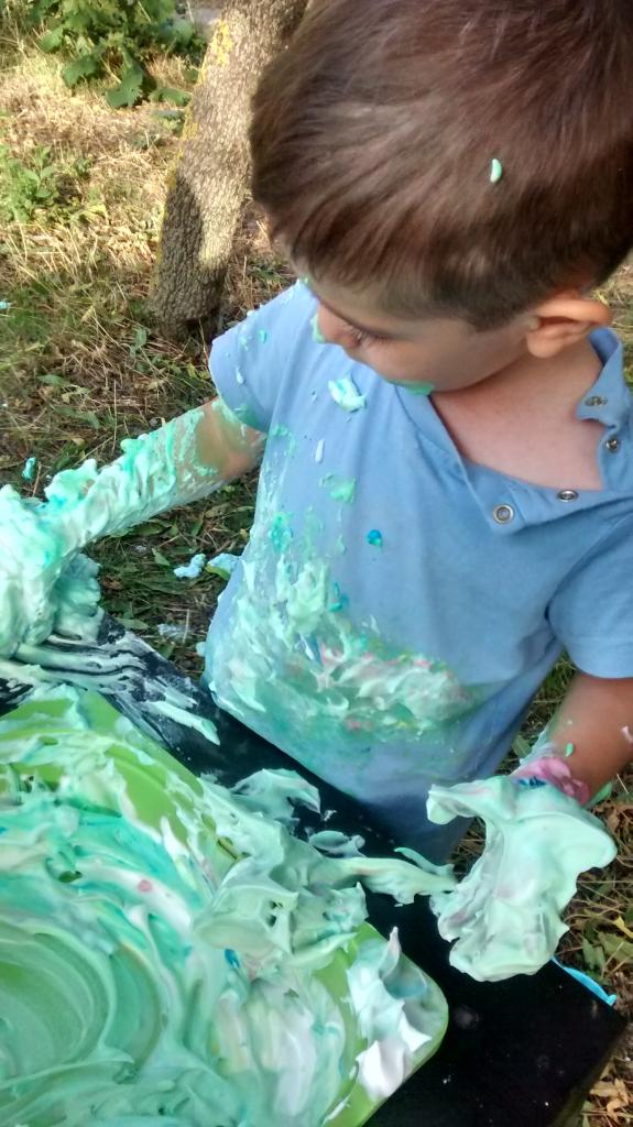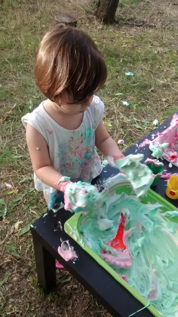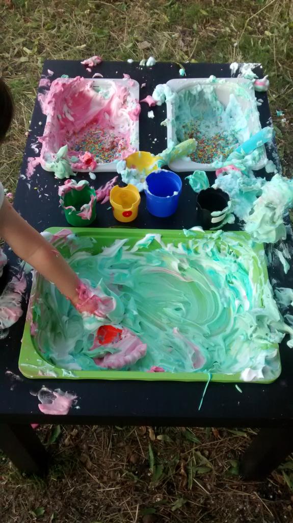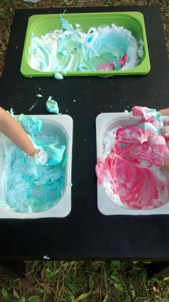 ¿Cómo lo hicimos? Pusimos la espuma de afeitar en las cajas Trofast de nuestra mesa sensorial, luego añadimos unas gotas de colorante alimentario a la espuma de afeitar y les dejamos que experimenten la suavidad de la espuma, los colores, qué pasa cuando mezclamos dos colores, los olores, las texturas… Podéis repetir el proceso para tantos colores como queráis. Yo les puse los colores primarios porque se pasan el día nombrando colores pero no aciertan ni uno los pobres, los confunden todos menos el rosa y el azul, y os prometo que no soy yo la que se los ha enseñado.