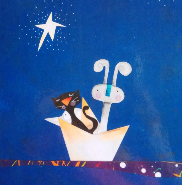 Las ilustraciones que acompañan a estas divertidas historias están realizadas sobre un fondo azul oscuro como la noche, con colores muy vivos que resaltan las características de cada personaje e imitando diversos tipos de texturas a partir de los suaves y dulces trazos realizados por Elizabeth Aguillón. Cada poesía está formada por una doble página ilustrada. Cada uno de los personajes protagoniza una divertida historia escrita en rima que consigue enganchar a todos los lectores, de hecho, mis hijos han dibujado a la Ballena viajera y a la gata.