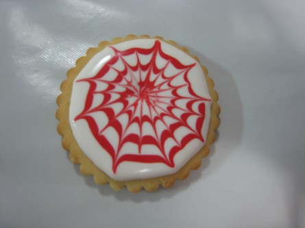 Para decorar esta galleta, primero he puesto una capa de glasa por encima, luego he preparado glasa roja y he realizado una espiral desde el centro hacia afuera de la galleta y con ayuda de un palillo, he arrastrado desde el centro de la espiral hacia afuera la glasa roja en línea recta.