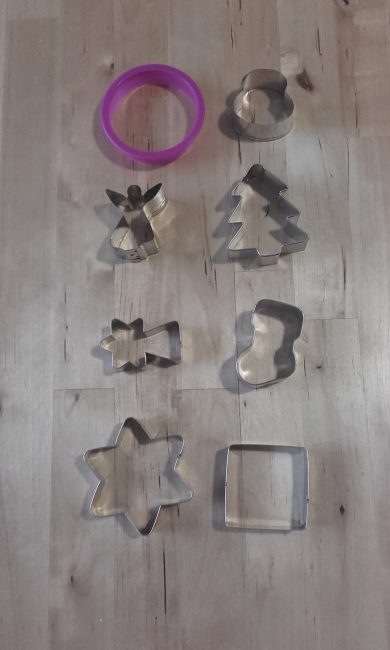 Mientras esperábamos hemos limpiado la cocina y preparado los cortapastas para darle forma a las galletas. Estos son los que ha elegido nuestro gran niño, aunque luego no los hemos utilizado todos: