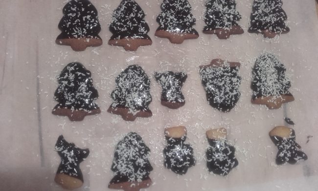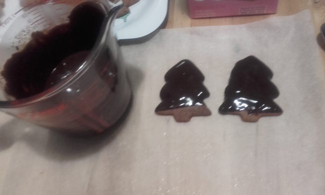 Ha habido una hornada que nos ha salido demasiado morenita, ¿las veis en la foto?, no me gustaban estas galletas para los profes así que las hemos bañado en chocolate para comerlas en casa. Morenitas o no creo que esta es una manera de hacer un postre chulo y bueno. Se puede prever y tener adornitos de azúcar, o hacerlos sobre papel de horno previamente y cuando se bañen las galletas se pueden poner por encima, decorar con manga pastelera (poner en una chocolate blanco y en otra chocolate negro y utilizar la imaginación)…