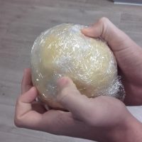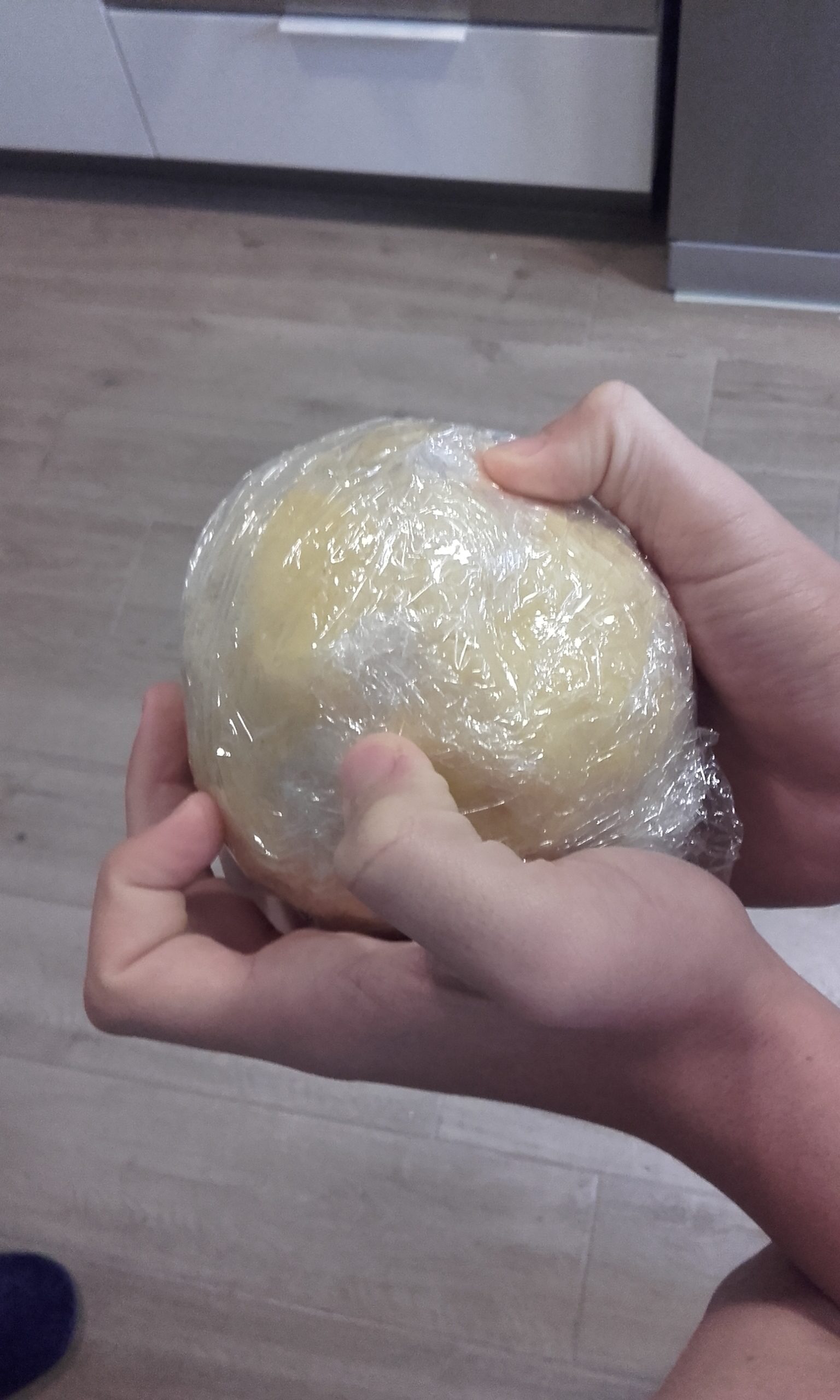 Una vez teníamos la masa, hemos hecho una bola y la hemos metido en la nevera envuelta en film transparente durante 30 minutos.
