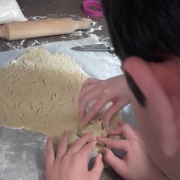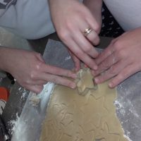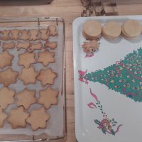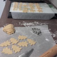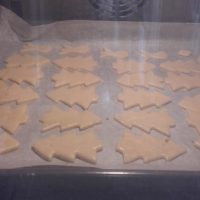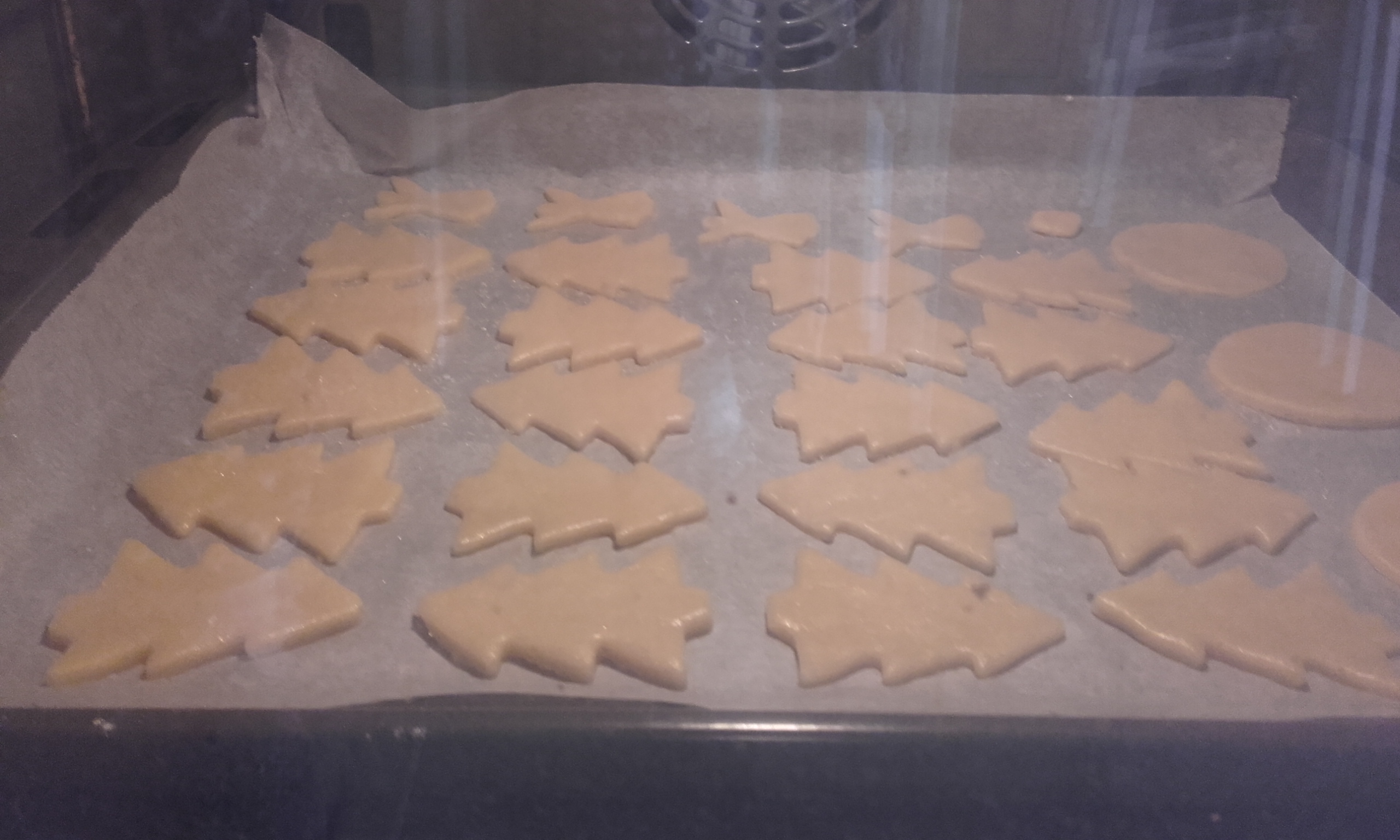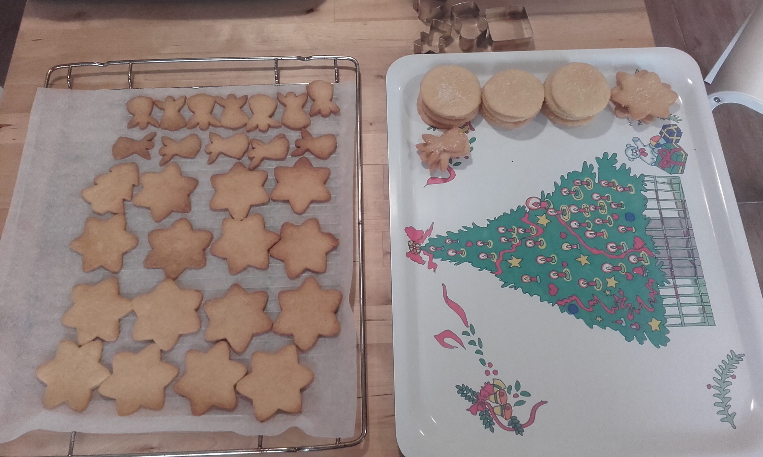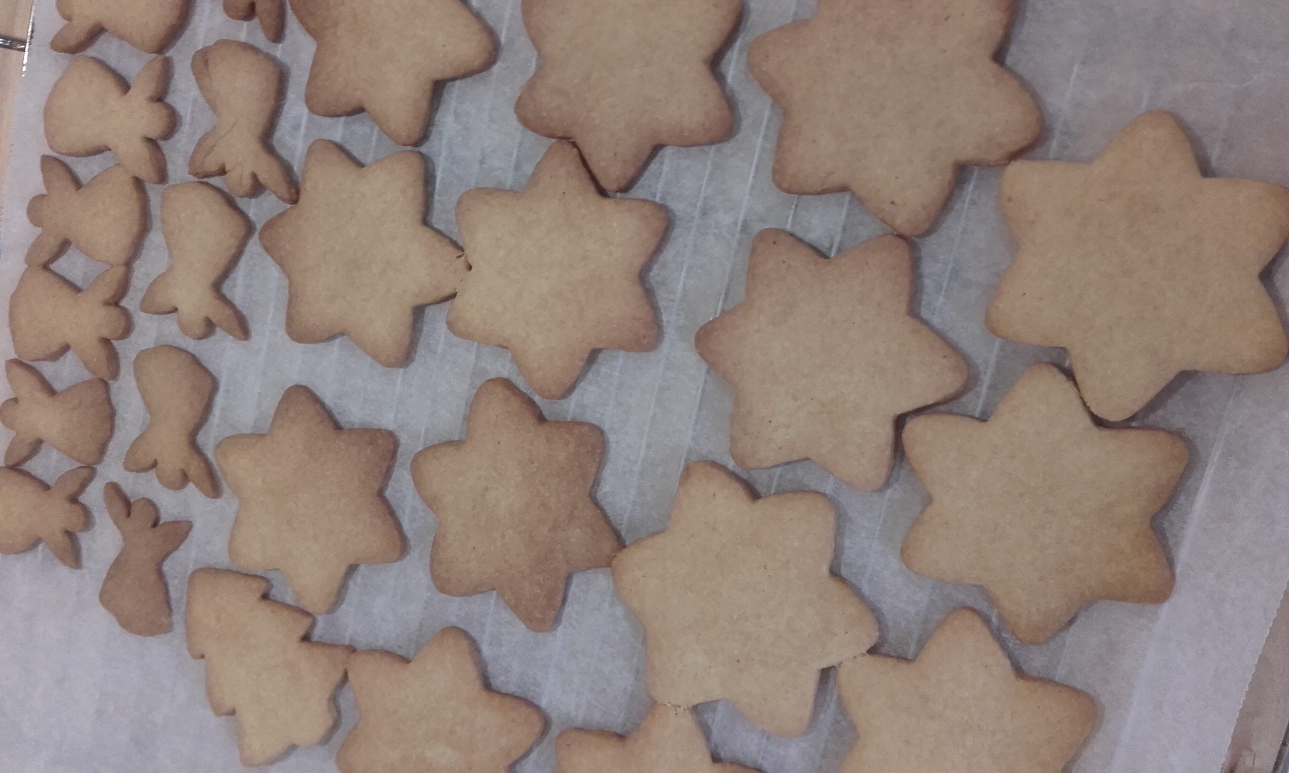 Una vez hemos extendido la masa y cortado, las hemos ido horneando. En el horno solo metíamos la bandeja lisa para no dejar marcas en las galletas. Aproximadamente cada tanda la teníamos en el horno 10 minutos. Cuando sacábamos las galletas aún estaban blandas así que las dejábamos reposar en la bandeja de rejilla.