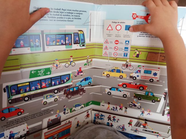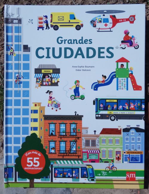 Grandes CIUDADES es un libro con más de 50 desplegables, pestañas, ventanitas, solapas… donde los niños pueden aprender cómo son las ciudades por fuera y por dentro en ilustraciones a doble página. Es un libro escrito por Anne-Sophie Baumann e ilustrado por Didier Balicevic. Este libro es de la Editorial SM y los niños de a partir de 3 años pueden disfrutarlo durante horas, los libros pop-up creo que son ideales para los niños de todas las edades, pero sobretodo para los más pequeños porque con ellos disfrutan leyendo, al tener un libro en sus manos y eso es lo realmente importante para nosotros en cuanto a la lectura.