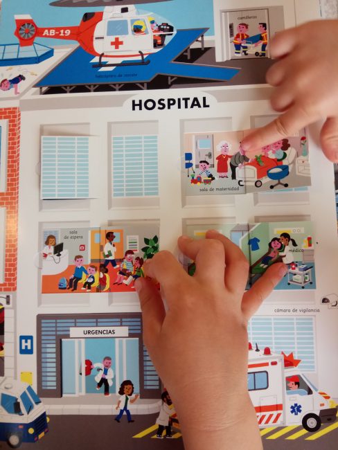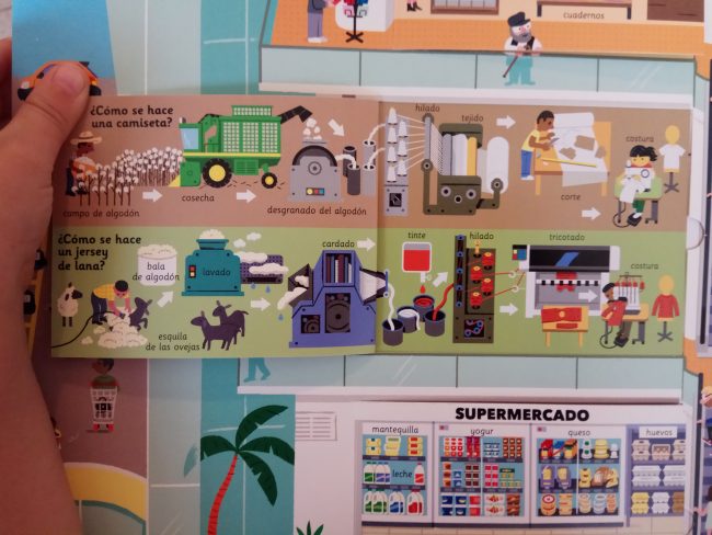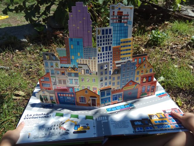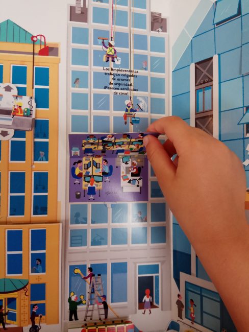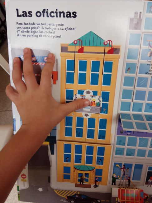También encontramos ilustraciones sobre el parque, el centro comercial (con sus diferentes tiendas), el hospital y los edificios del barrio. Realmente es un libro precioso, con todo lujo de detalles, ilustraciones grandes, pequeñas, coloridas, llamativas y preciosas. El libro acaba con un pop-up de una ciudad que está en constante evolución.