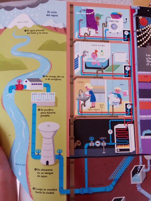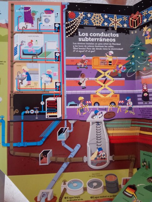 Y continúa con los conductos subterráneos que tenemos en las ciudades. Ésta ilustración es especialmente completa desde mi punto de vista porque ofrece la posibilidad de visualizar claramente el ciclo del agua, cómo reciclar los residuos, conocer de qué tipos de energías disponemos y cómo utilizarlas adecuadamente… con esta ilustración podemos pasar mucho tiempo entreteniéndonos en cada detalle para que los niños adquieran sus primeros conocimientos sobre cómo cuidar el medio ambiente.