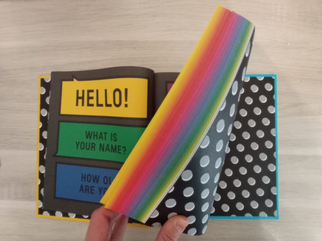 Algo que nos encantó es que cuando inclinas la totalidad de las páginas del libro hacia un lado, aparece el arco iris en el borde del libro.
